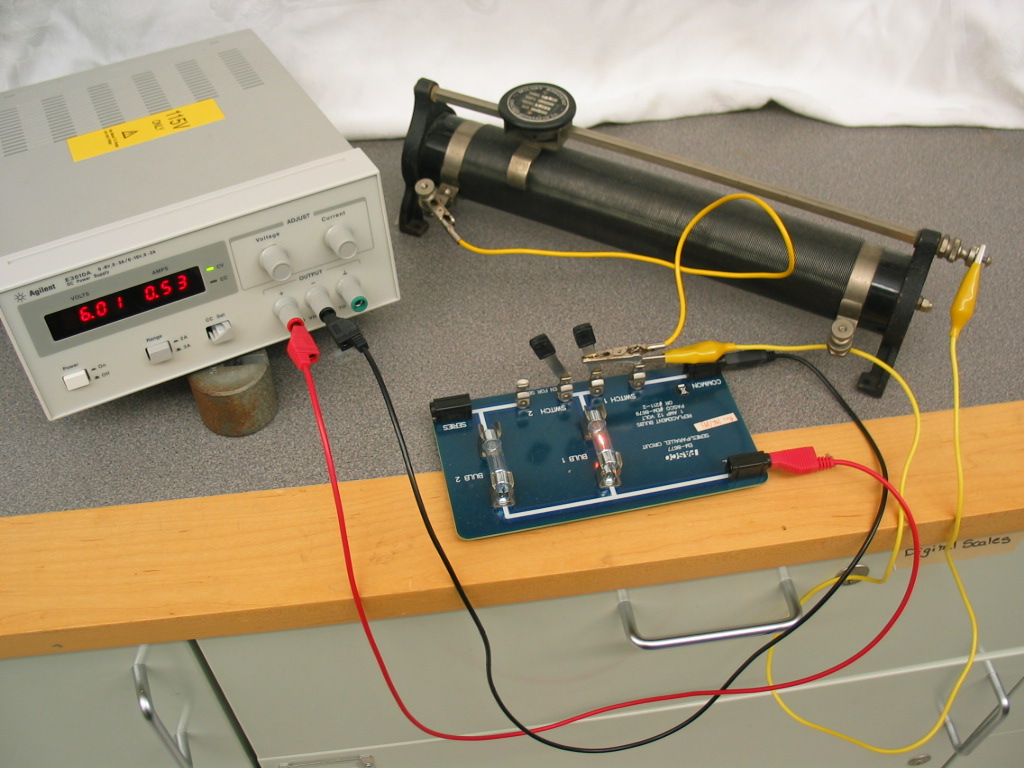- Set the power supply voltage to 6 volts. With both switches open on the EM-8677 Series/Parallel Circuit Board, connect the + and � terminals of an HP/Agilent power supply to the �common� and �parallel� connections on the circuit board. Using alligator clips (shelf B2) connect the rheostat across the left and top-right terminals of switch 1 as shown. Move the rheostat slide to the zero (left-most) setting. The bulb should glow brightly. Now move the rheostat slide to the right, increasing the length of wire the current must go thru. The bulb should dim, showing that increasing the length of wire decreases the current in the circuit even though the voltage applied to the circuit stays the same. This is equivalent saying that the resistance of the circuit increases as the length of wire increases.