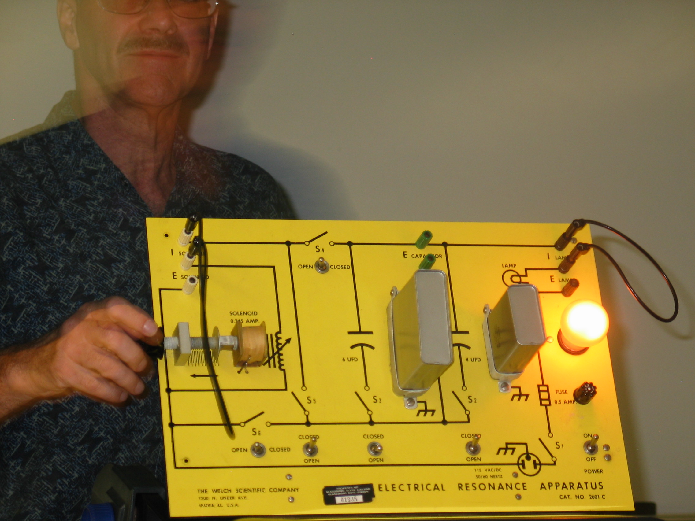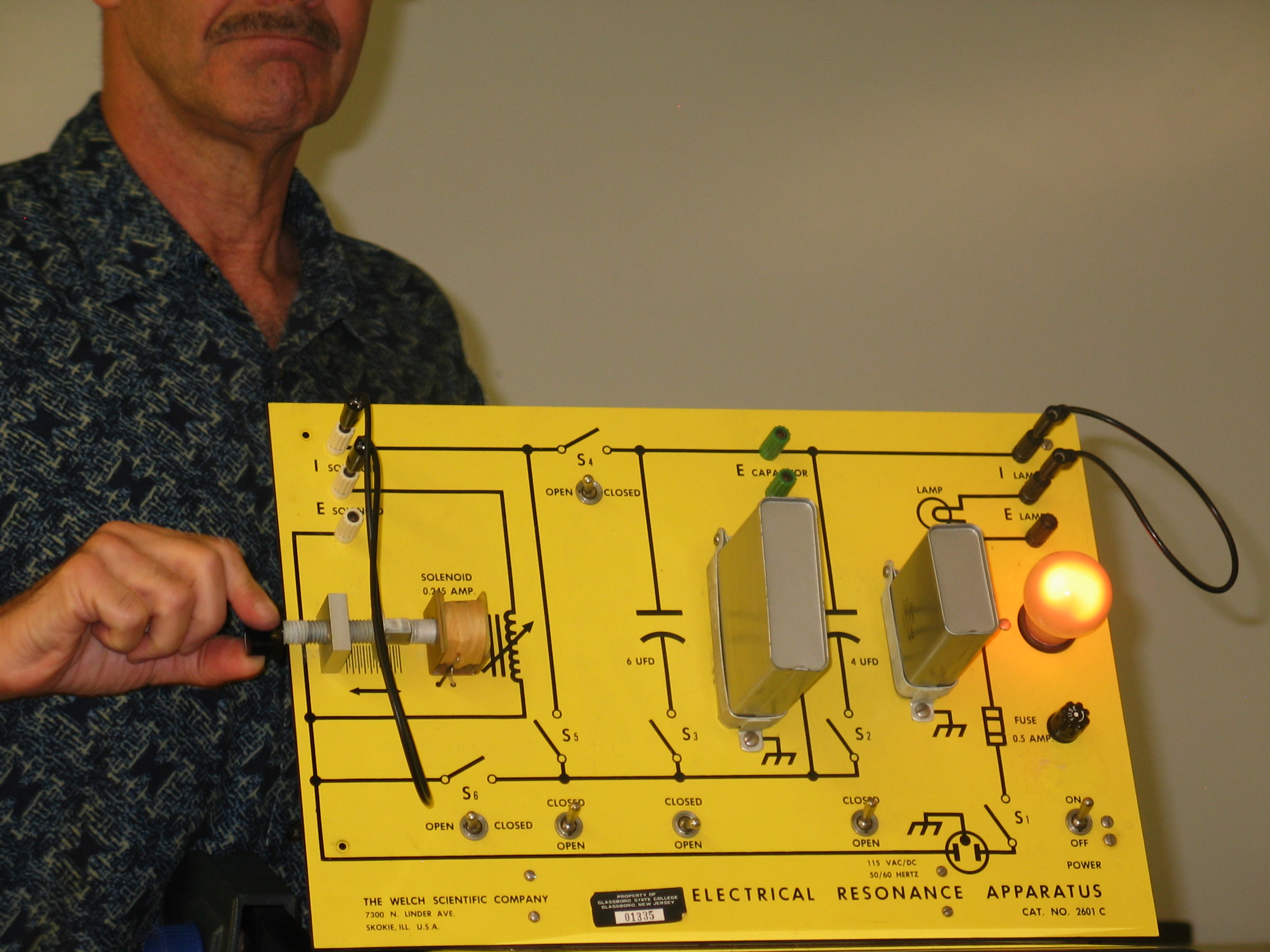 - Make sure the power switch, S1, is in the OFF position before plugging in. Connect the two �I SOLENOID� terminals and the two �I LAMP � terminals using patch cords (if they are not already in place). Position the switches as follows: S2 � closed; S3 � open; S4 � open; S5 - closed; S6 � open. Unscrew the solenoid (i.e. variable inductance) core all the way out of the coil (see left photo). You now have a 60 Hz series LCR circuit with C= 4 microfarads. Turn the power switch, S1, on. The bulb should light dimly. (left photo)