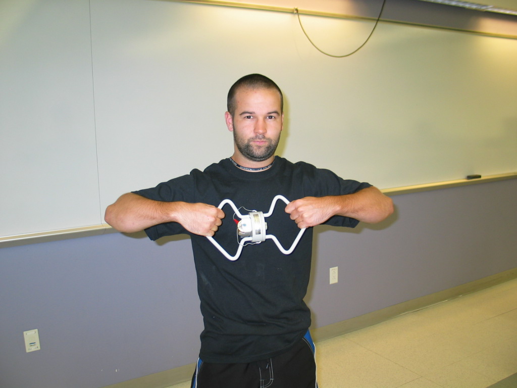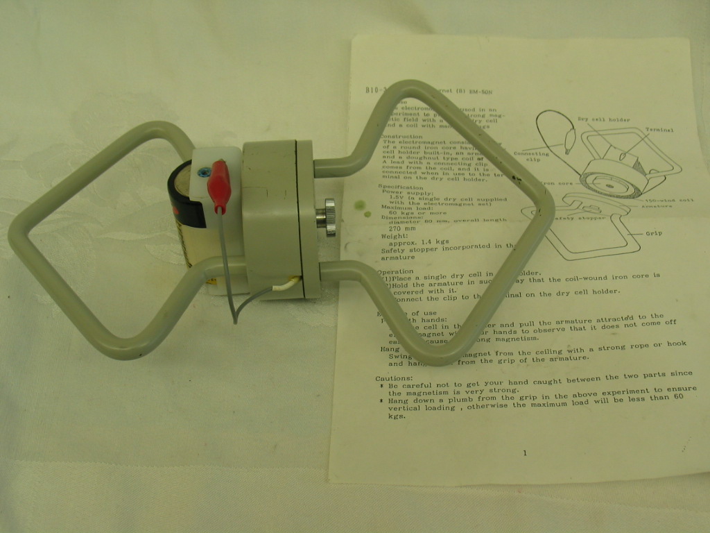 - This electromagnet consists of two handles, a 150 turn wire coil, an iron core (ferromagnetic core), and a 1.5V battery and terminals. There is a safety screw that should be used to prevent any accidental throwing of one end of the electromagnet across the room. (I almost did that!) With the battery disconnected, show the class there is little or no magnetic field, and let them see that inside is just a wire coil and iron core. Line up the two plates and be careful not to get any fingers in between. With the plates together, connect the battery by clipping the red alligator clip to the battery terminal. A magnetic field is produced due to the current in the wire loops, and the iron core intensifies the field. The electromagnet is strong enough for a maximum load of 60kgs, so most or all students should not be able to pull it apart.