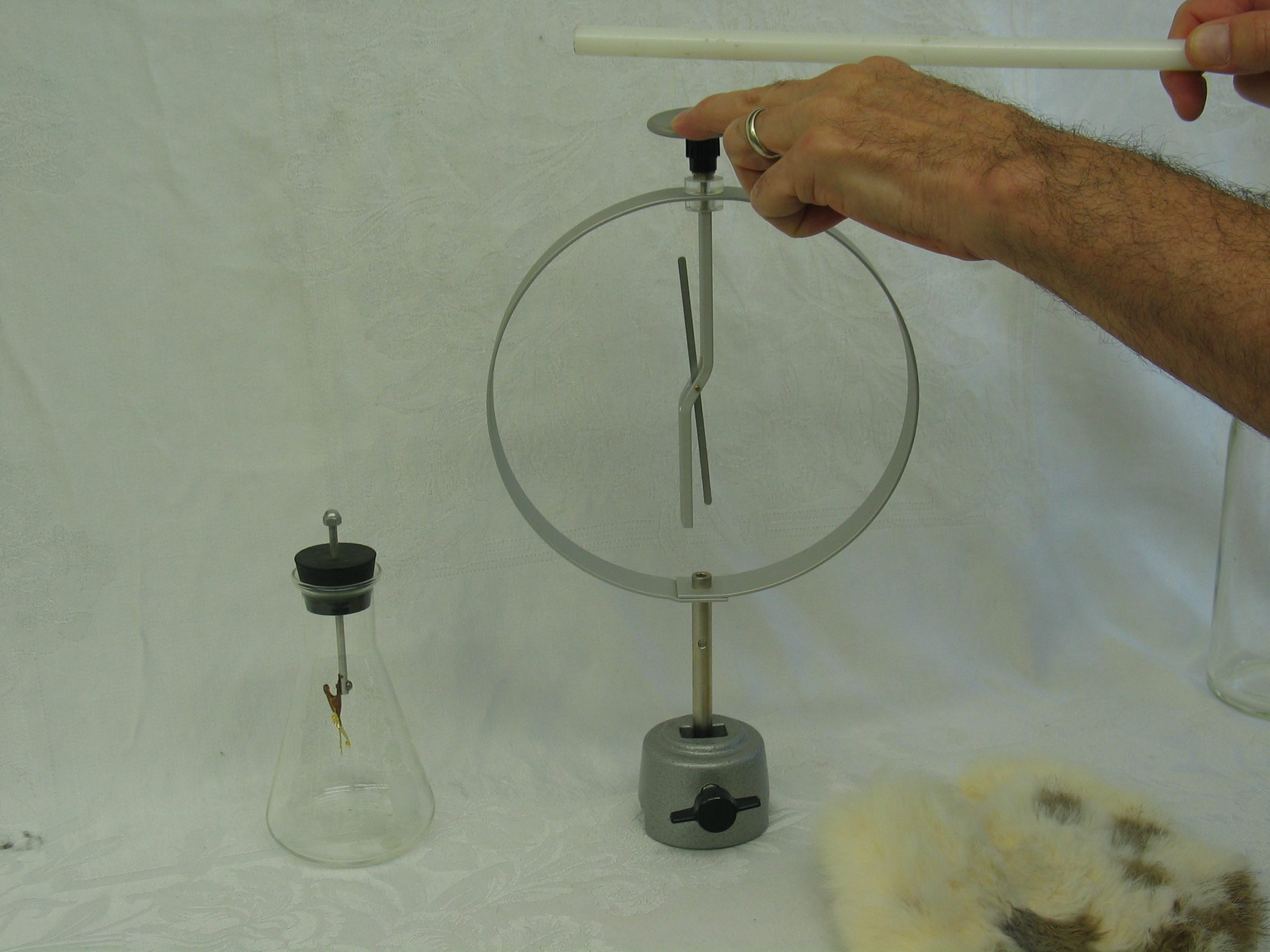 - Use the TeflonR rod and fur with the large (Braun) electroscope to show that the (negatively) charged rod can be used to induce a net positive charge on the electroscope. First, hold the charged rod near the top of the electroscope (but not touching it) to show that charge can be �induced� on it without contact. While holding the rod near the top, use your other hand to touch the top of the scope and watch it appear to �discharge� (first photo). Next, remove your hand from the scope, and slowly move the rod away from the electroscope, resulting (perhaps surprisingly) in a net (positive) charge being left on the electroscope.