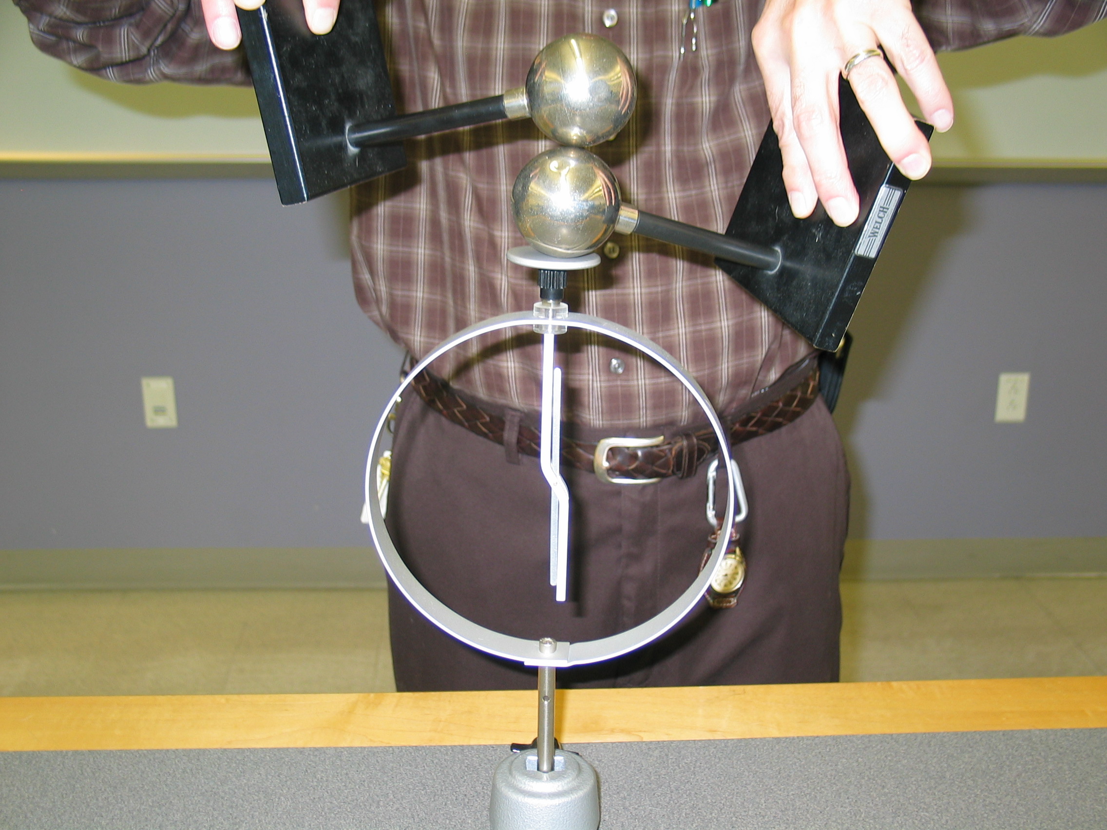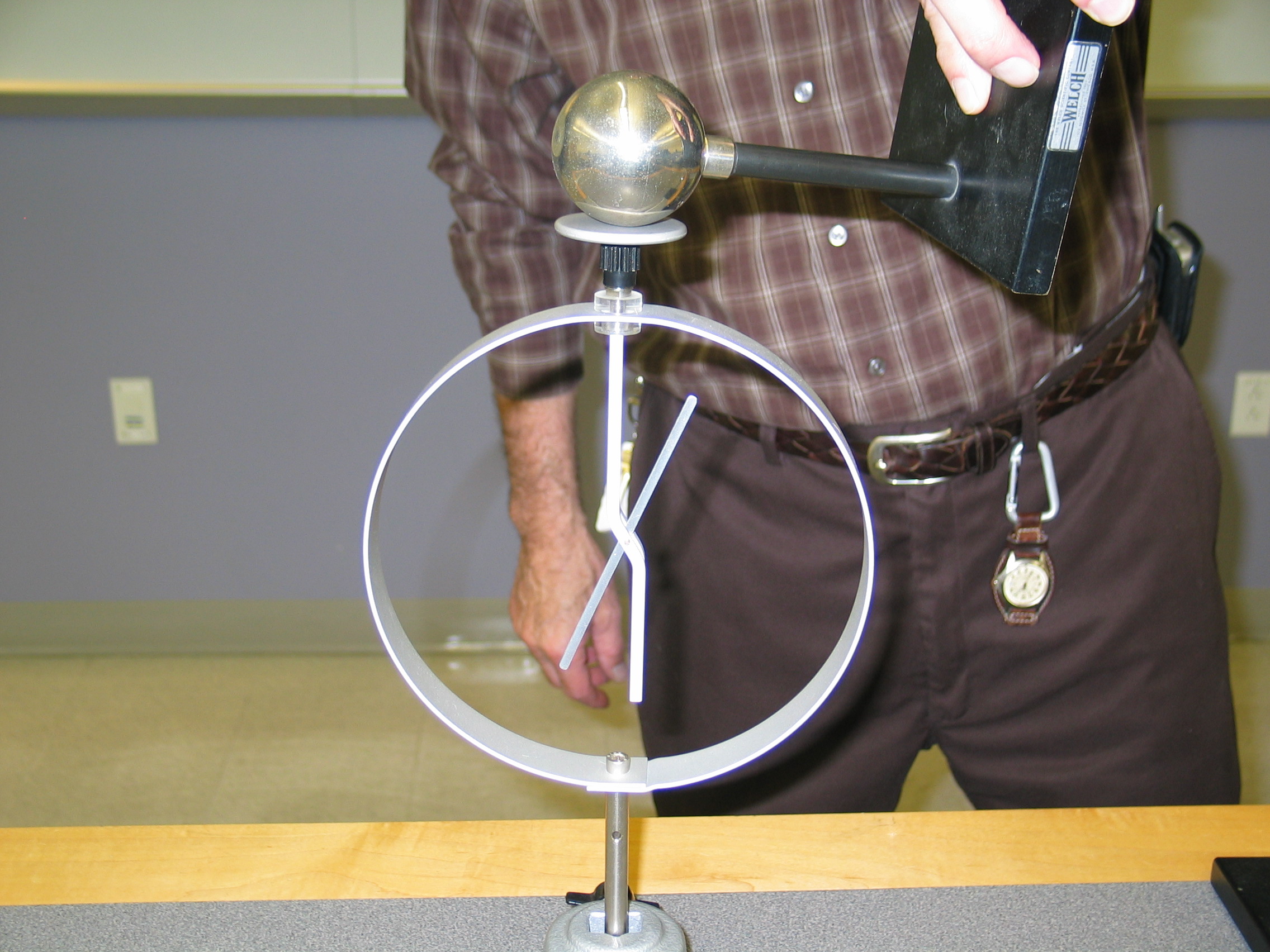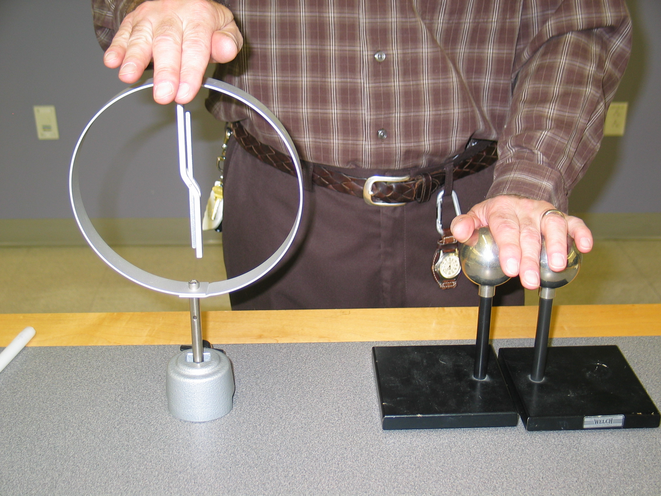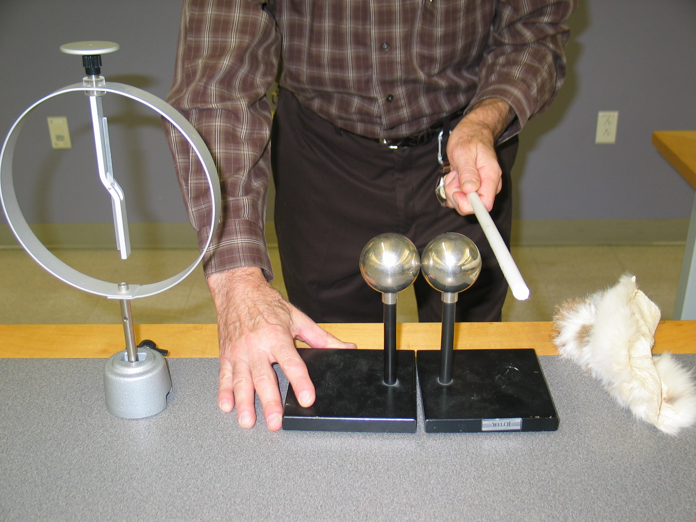 Ground both spheres and the electrometer by holding your hands firmly on them and show the students the there is no charge on either sphere by holding each in turn to the top of the electrometer. Then, charge the TeflonR rod using the fur and hold it near the spheres while they are in contact (2nd photo). Remove one sphere, with the rod still near the other, and touch it to the electroscope, showing that is has acquired a net charge (3rd photo). Finally, touch the other sphere to the first sphere to show that the net charge on the two of them is zero, implying they have equal but opposite charges.