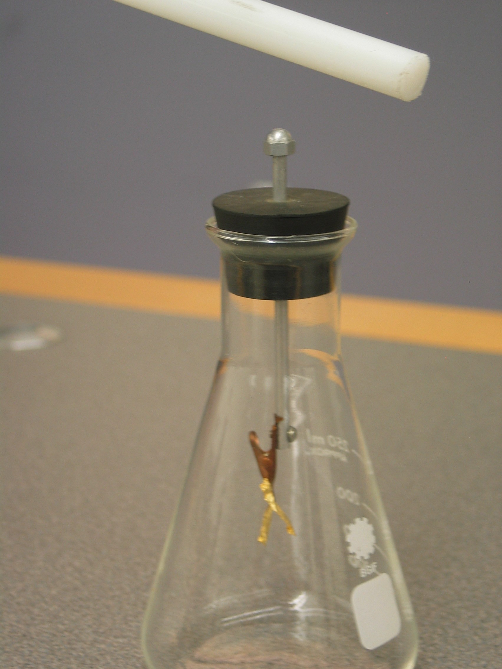 Using the rod and fur, show that the charge on the rod induces (no contact) charge on the gold leaves in the flask electroscope (2nd photo, top). Then cover the electroscope with the wire cage and again try to induce charge on the electroscope leaves. No response! The electric field is blocked.