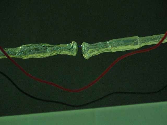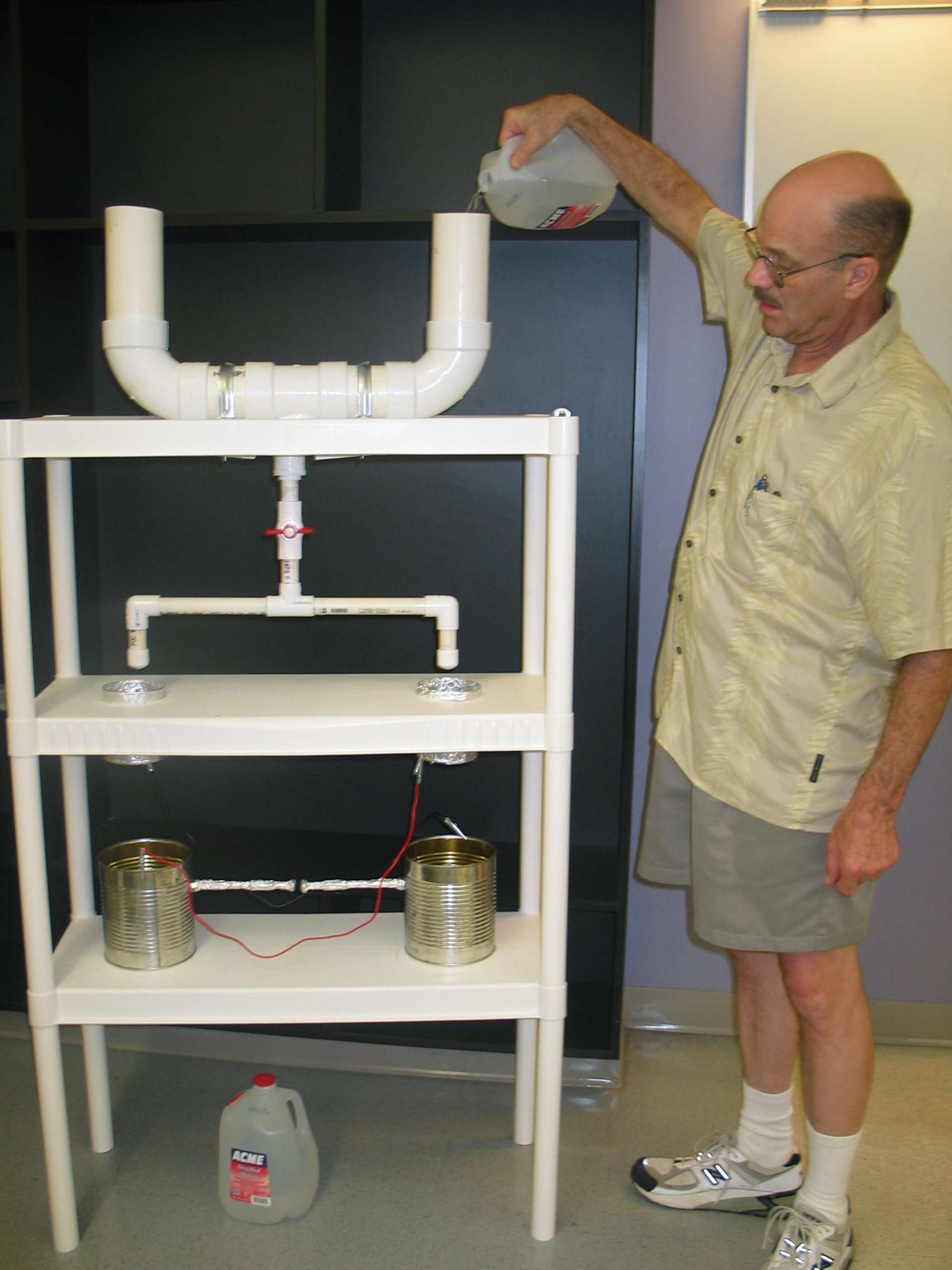 Align the large cans in the circles drawn on the bottom shelf, and connect the right, upper cylinder to the left large can as shown above (red cord with alligator clips). Clip the left upper cylinder to the large can on the right using the black cord (not easily seen in photo). Make sure the cords do not come to close to each other or anything else that could result in a discharge path. With both cans empty, their combined capacity is about 1.5 gal., but 1 gallon of water should be plenty to pour into the top. The device exploits the fact that water droplets falling out of the PVC downpipes acquire slightly different small amounts of charge, and uses inductive feedback to amplify the effect, resulting in a discharge spark between the electrodes (right photo). A description of the design and operating principles may be found at: