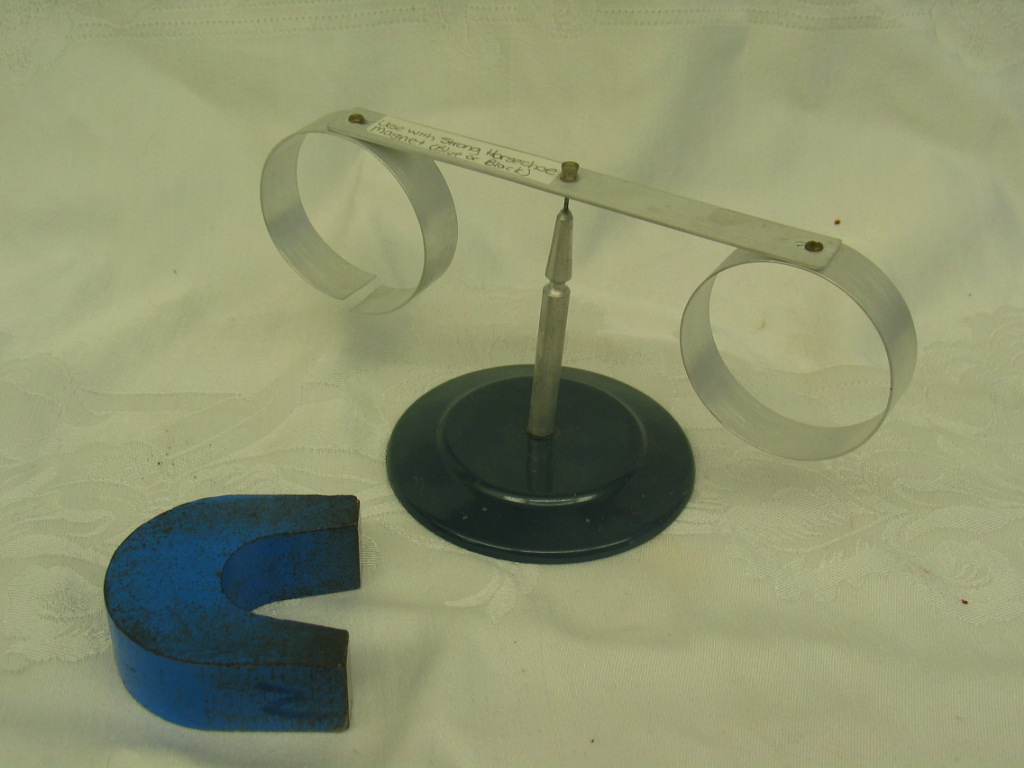 - Place the ring apparatus on the table and make sure it is level. Give it a tap to make sure it is moving freely with minimal friction. The rings are aluminum, so show the class when the magnet is brought up to the rings very slowly, there is no magnetic attraction between the materials. Move the horseshoe magnet in and out of the continuous ring without touching it, to show that the motion of the magnet is inducing eddy currents around the ring. The class should be convinced that eddy currents are being induced because they produce a magnetic field that is causing the ring to move with the magnet. When the magnet is pulled away the ring will again move in the same direction as the magnet. Repeat with the ring that has a slit in it to show that the slit prevents strong eddy currents from occurring, so the ring doesn�t move.