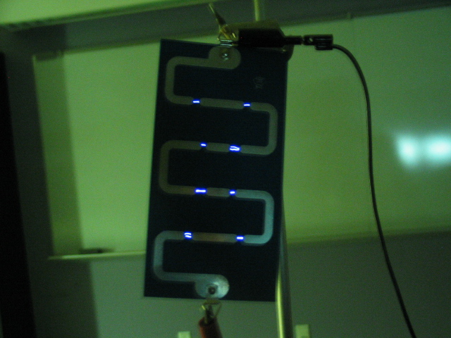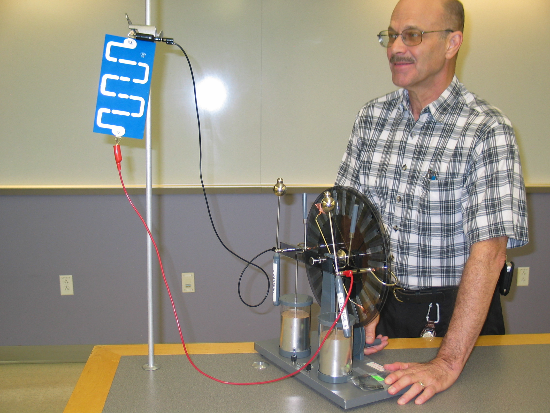 - Get a vertical rod from the vertical bins near the door to room 144 and attach the rod clamp with the wooden dowel at a good height for visibility. Hang the lightning plate from the dowel and attach the alligator clips from the Wimshurst + and - terminals to either end. The Leyden jars on the Wimshurst should not be connected. Turn the lights down for best effect. Just a few turns of the crank should generate a potential difference large enough to result in discharges across the gaps (typically at least 25,000 volts!).