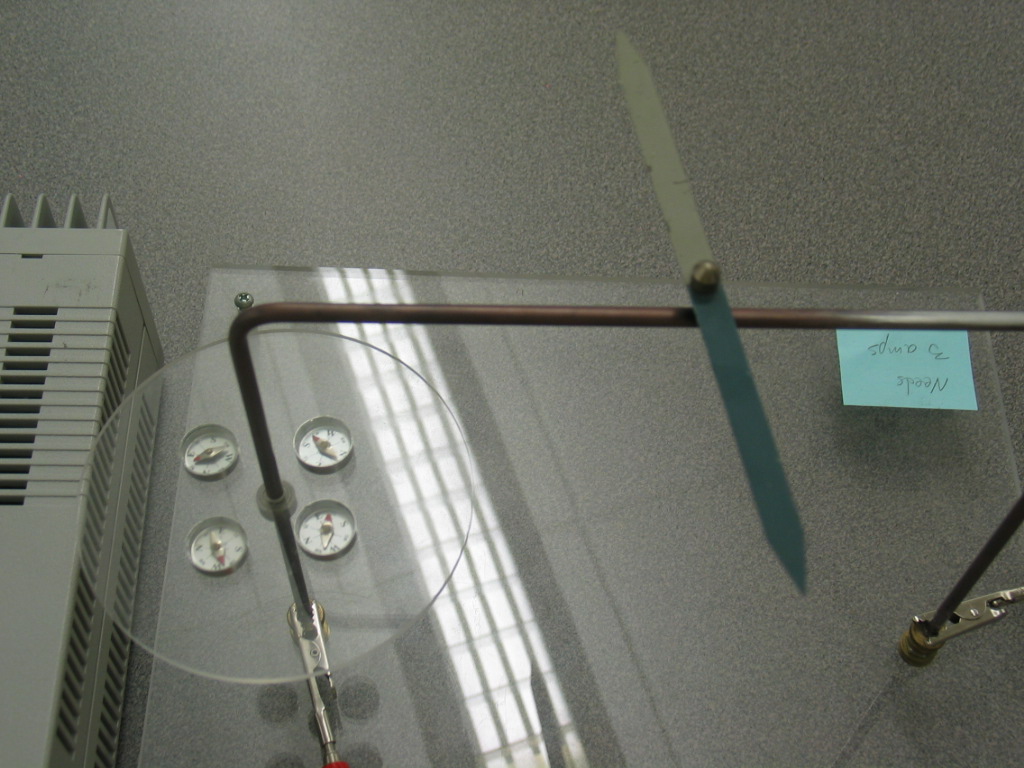 - Using banana-to-alligator leads; connect the terminals of the power supply to each end of the �wire� on the apparatus. Place a few small compasses on the plastic platform around the wire. Notice the direction of needles as well as the compass needle on the top of the wire. Turn the power supply on and turn the current up to about 3 amps. Observe as the needle on the top is deflected. Tap the plastic platform and notice the compass needles make a ring around the wire. If you have trouble seeing the deflection on top, use the smaller compass needle taped to the base of the apparatus.