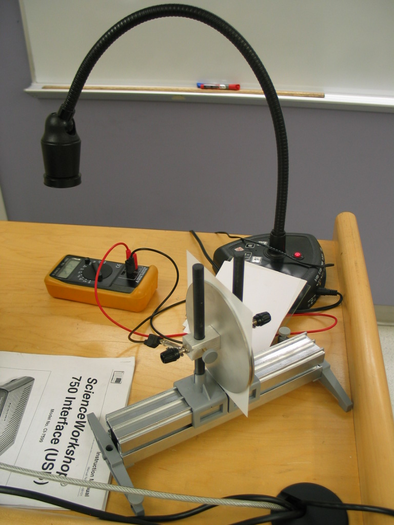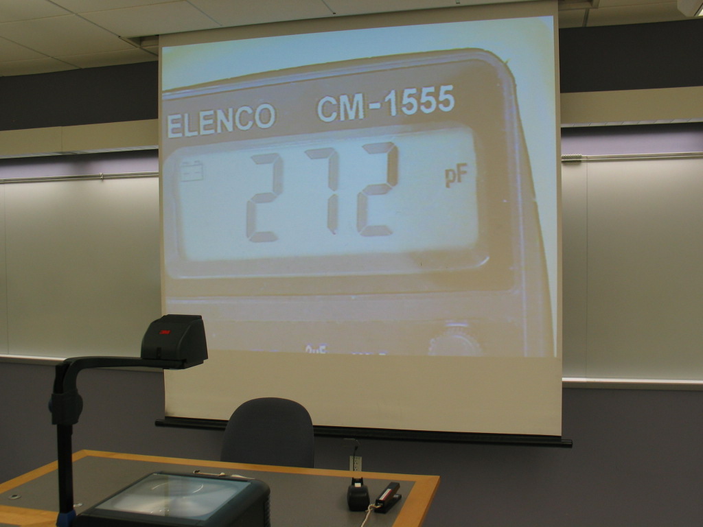 Connect the leads of the capacitance meter to the parallel plate capacitor and position the meter under the camera so that it is displayed on the projector. The plates on the capacitor can be moved towards and away from each other to demonstrate how the capacitance will change based on the separation distance. There are also cardboard, paper, plastic, and glass sheets that can be placed between the plates to change the capacitance. When using these, position them between the plates and move the plates towards each other until they are holding the sheets firmly in place.
