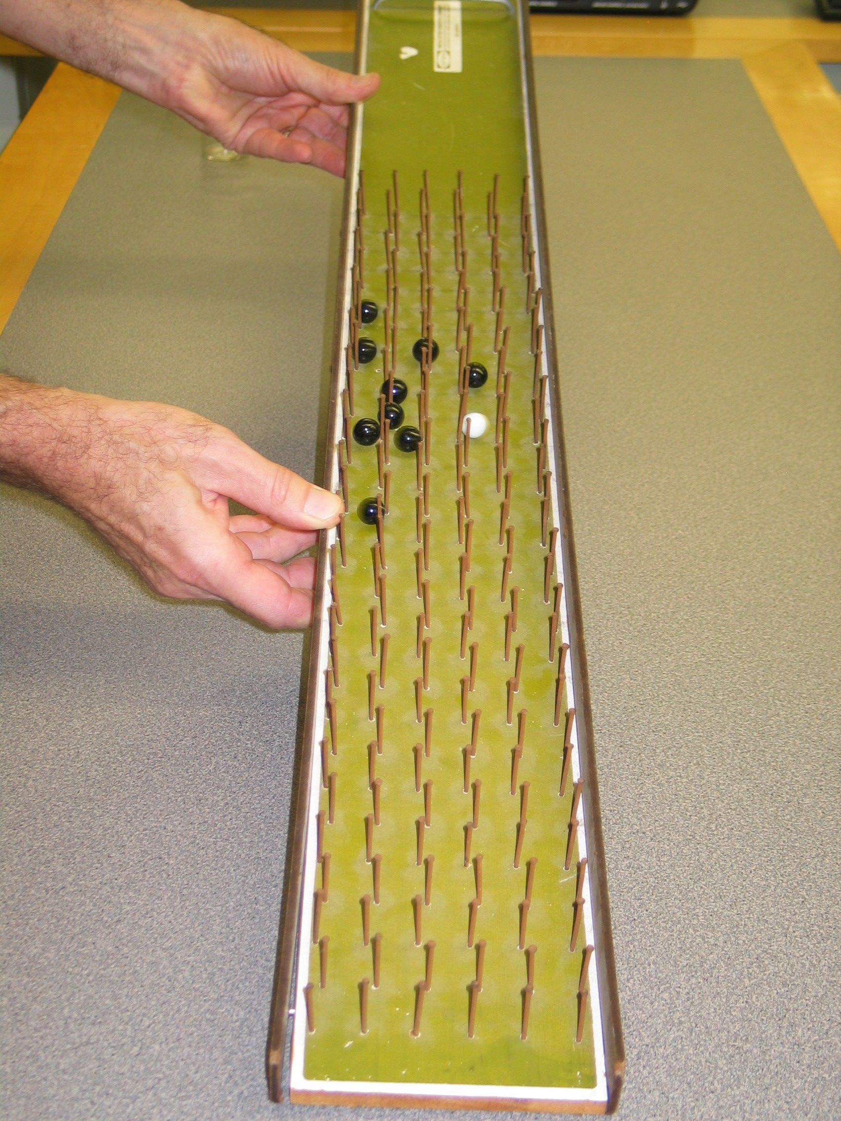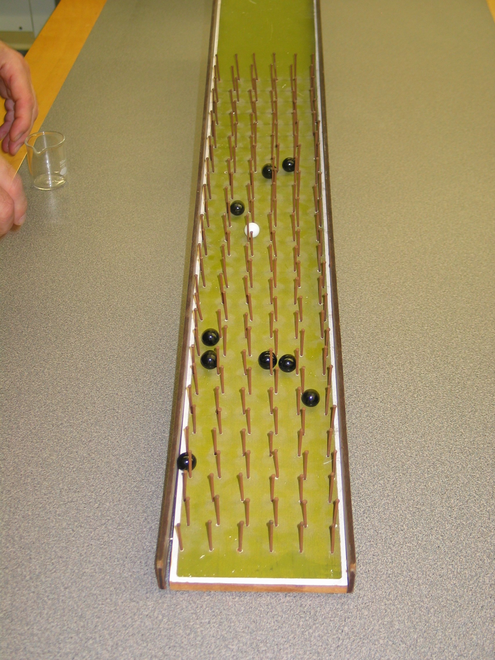 - Set up the ramp and pour the marbles onto the top end, above the nails. Let them roll down the ramp to demonstrate the how electrons travel through a wire with some resistance. The nails represent atoms or molecule. (You may need to shake the ramp a little, or manually move some marbles to keep them from getting stuck.)