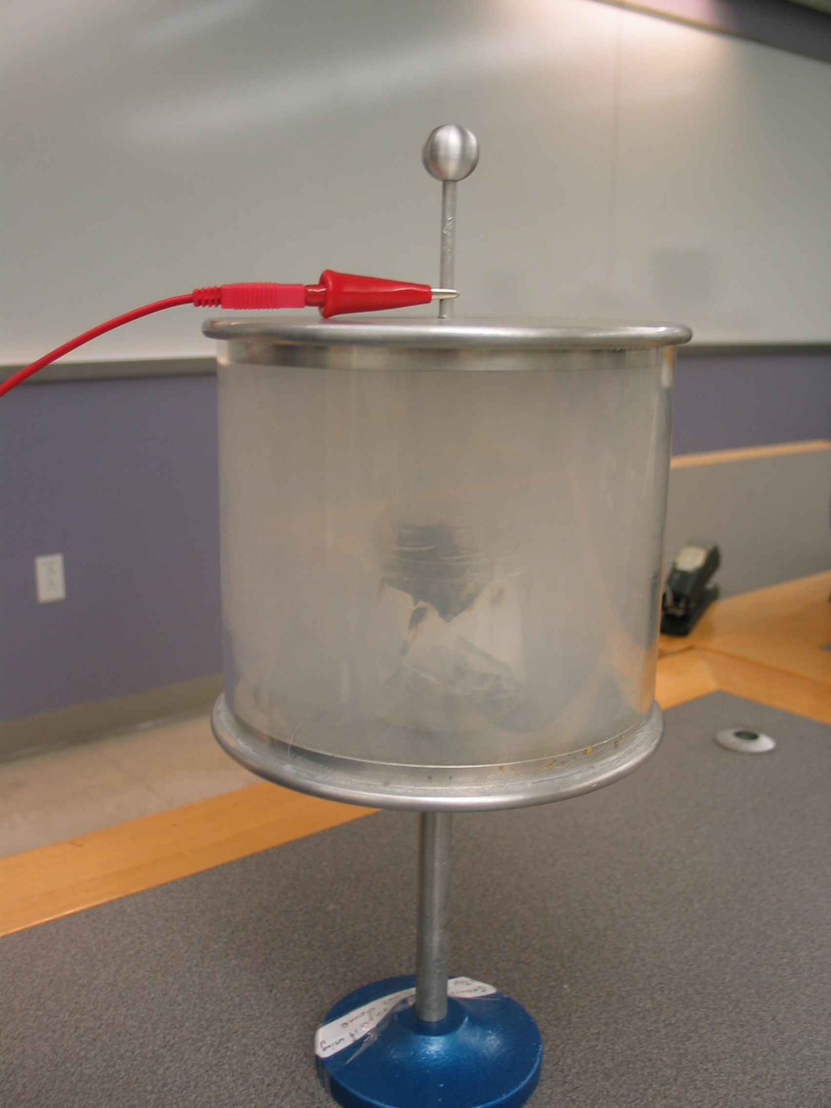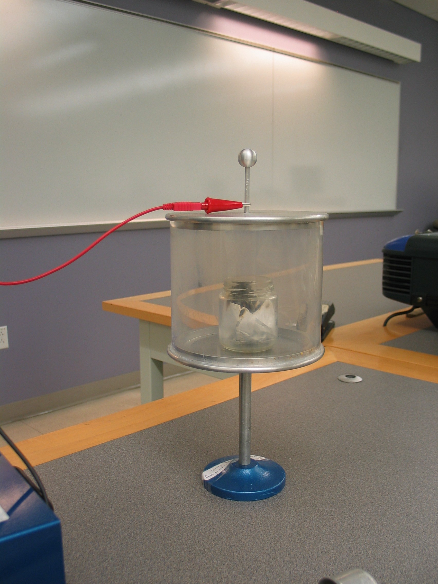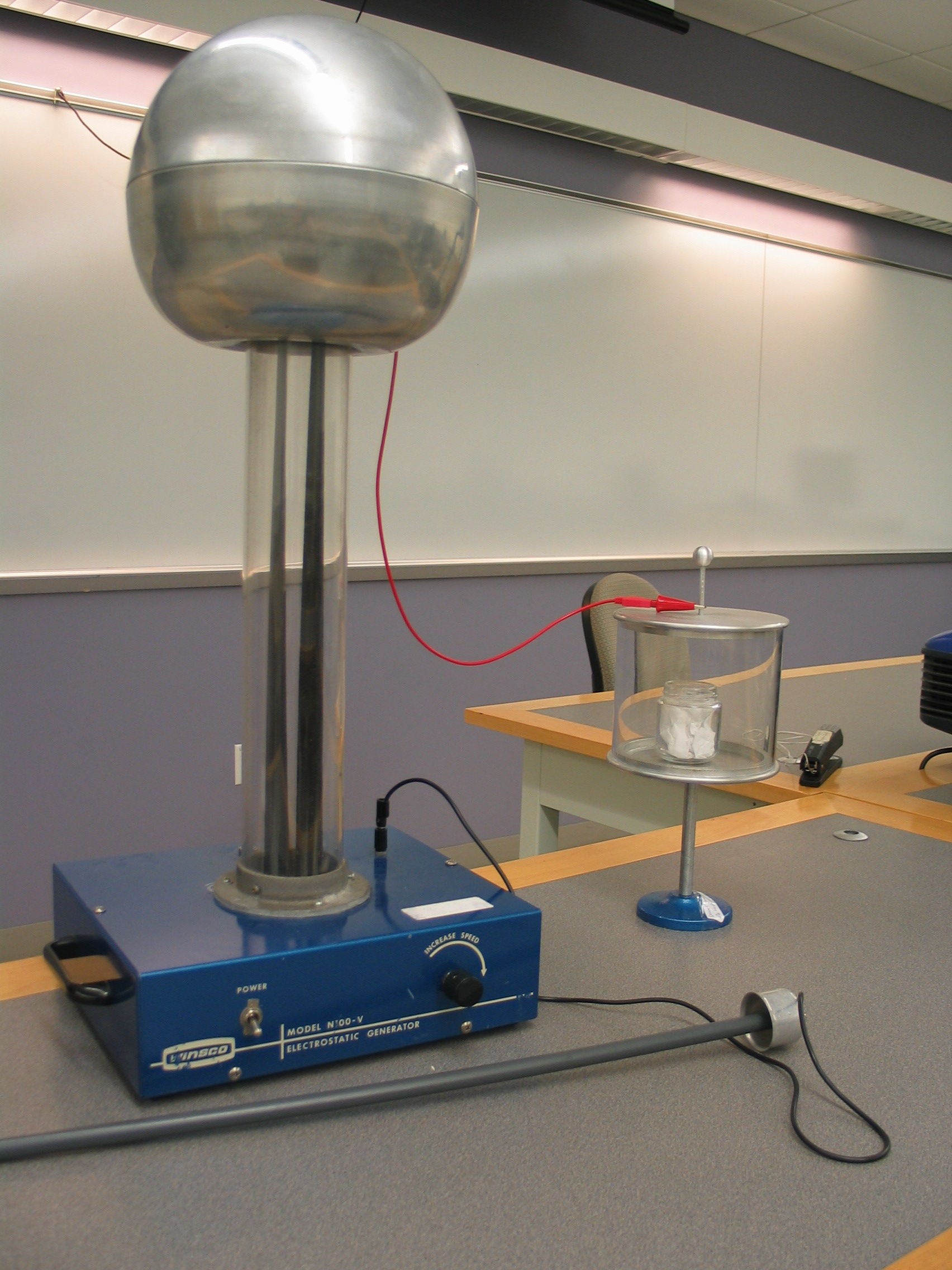 Place a piece of paper in the small glass jar. Place them in the �Volta�s Hail Storm� apparatus near the VdG. Tape the banana plug end of the patch cord to the top of the VdG and clip the other end to the top post on the lid of the apparatus as shown in the first photo. Remove the top and place a lit match into the jar to ignite the paper. Once the fire is established, put the lid back on and the apparatus will fill with smoke as the fire burns out (second photo). Turn the Van de Graaff generator on and watch the smoke clear!
