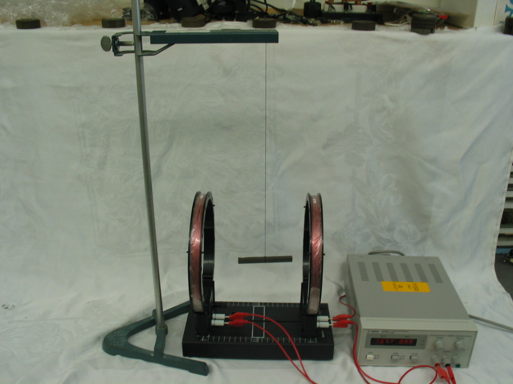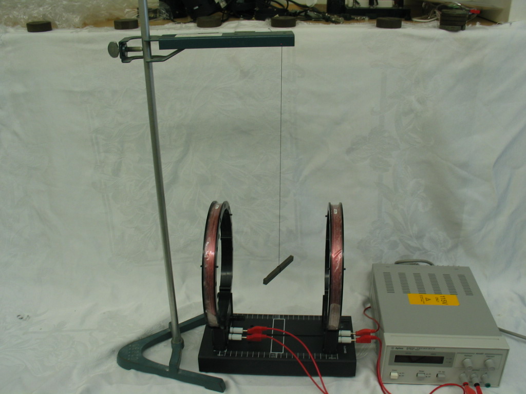 - Connect the power supply in series with the Helmholtz coils and attach the clamp to the vertical rod such that the bar magnet (dipole) is at the same height as the centers of the coils. Let the dipole come to its rest (i.e. equilibrium) alignment. Place the Helmholtz coils such that their magnetic fields would be approximately perpendicular to the bar magnet (left photo). Turn the power supply on and increase the current to show that a torque is exerted on the dipole causing it to align with the magnetic field (right photo).