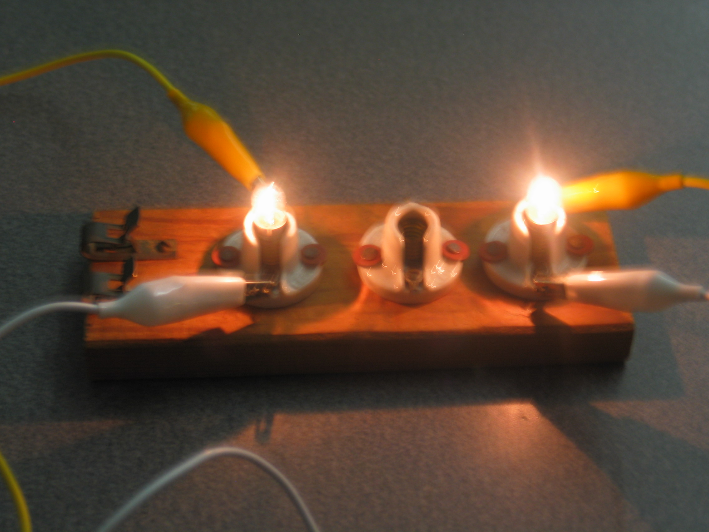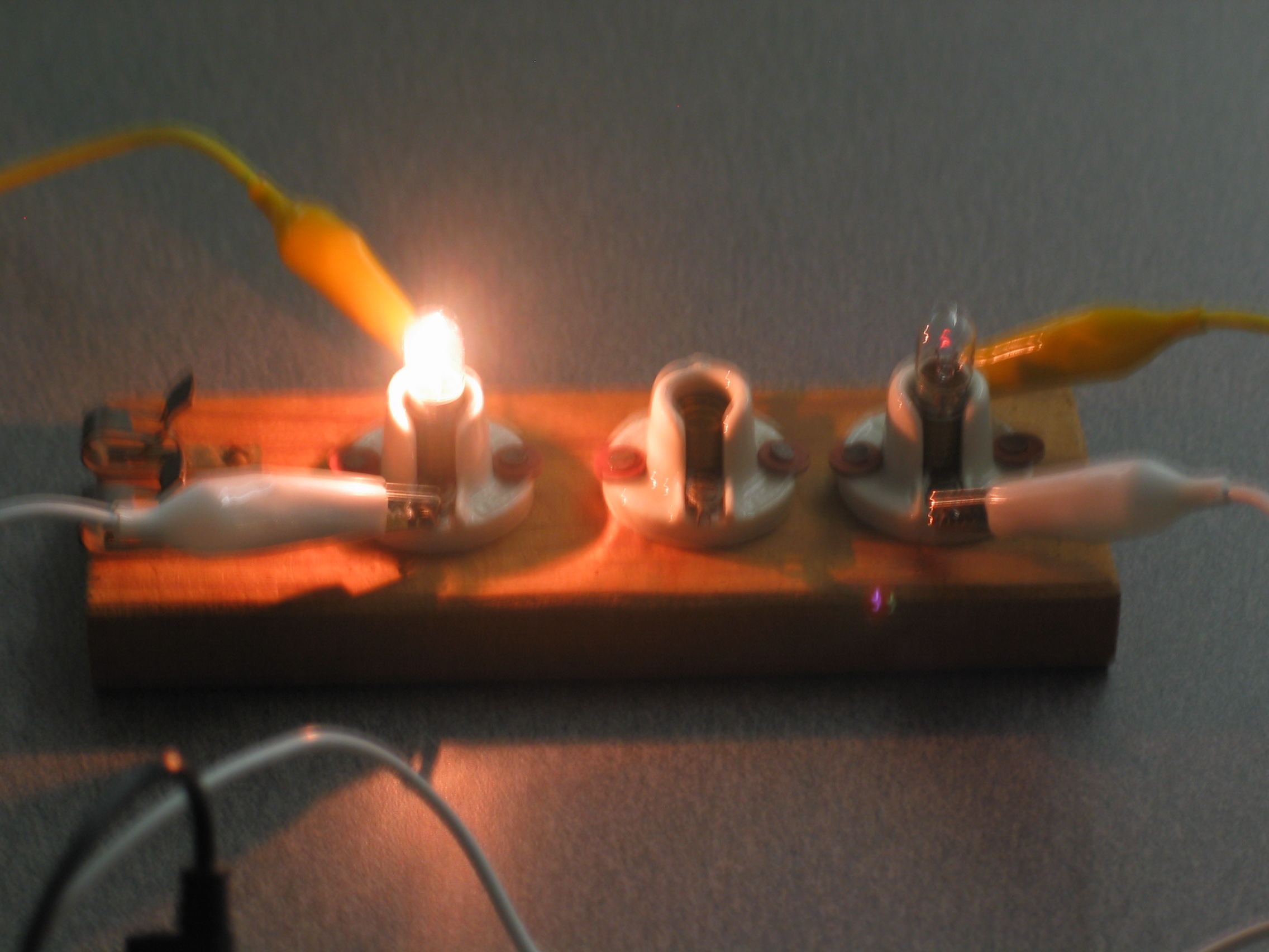 The outer coil has more turns then the inner coil, so to step up the voltage we will want to apply power to the inner coil. To step down the voltage we will want to apply power to the outer coil. Begin by connecting the inner coil to one light bulb and the outer coil to the other light bulb (top photo). Set the power supply and voltmeter to 6 V AC, and apply about 4 amps of AC current to the outer coil and observe that the outer coil�s light bulb is bright, while the inner coil�s light bulb is dim (left photo). Now apply the power to the inner coil and observe that the inner coil�s light bulb is bright, but the outer coil�s light bulb is a little brighter (right photo). You can move the inner coil in and out and observe as the outer coil�s light bulb varies in brightness. Use the voltmeter as a visualization of the step up & step down. (Attach the voltmeter to the coil that is not connected to the power supply.)