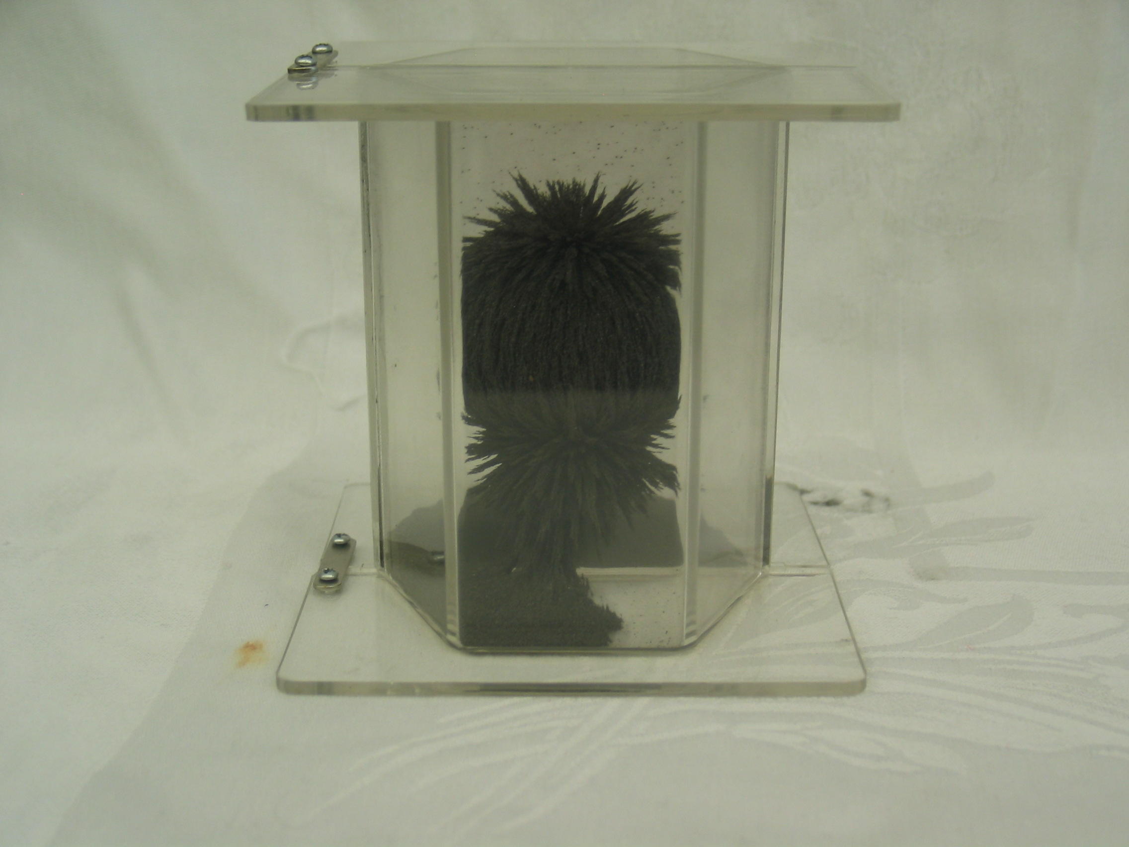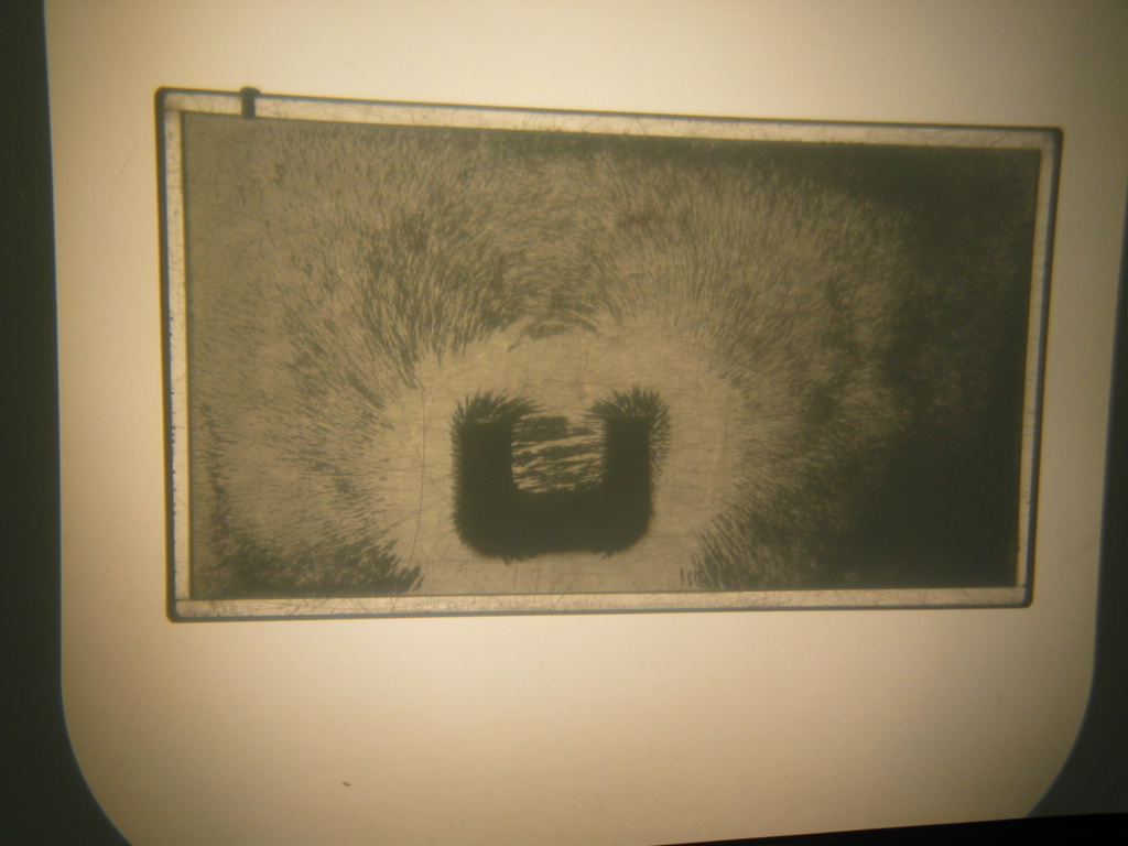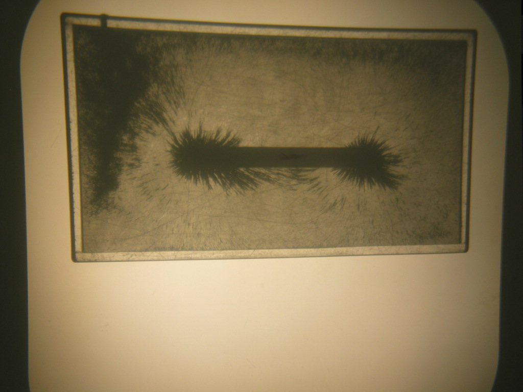 - The top pictures were made by placing a magnetic field visualizer (a sealed case with iron filings floating in oil) on an overhead projector. First, shake the visualizer to get a fairly uniform distribution of filings, then, place any permanent magnet on top. Lightly tap the visualizer in order to coax the iron filings to form the magnetic field lines. The bottom picture is of a 3D magnetic field visualizer with a cylindrical permanent magnet at the center of the plastic casing. When this viewer is shaken the iron filings inside the case align with the magnetic field lines making them visible. (It can be opened for inspection.)