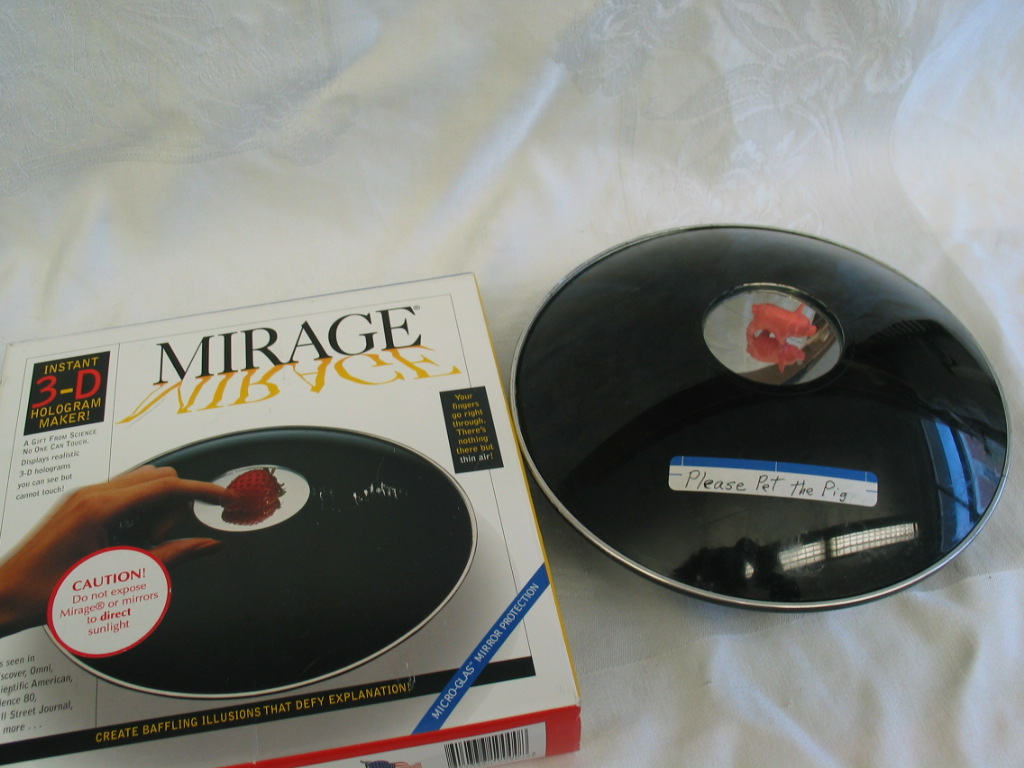 - Students find this demo fascinating! Although it is not a true hologram, it creates a 3-D image of the object placed in the center of the base mirror that appears to float above the circular opening on the top. When students go to touch this realistic image, they find that there is nothing there but thin air. You have to observe it from the correct angle (not directly above). When viewed from directly above, students can see (and touch) the reel object inside (a pig in the above photo).