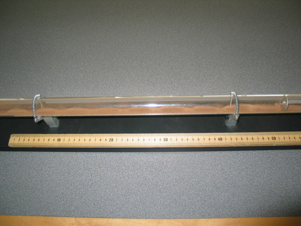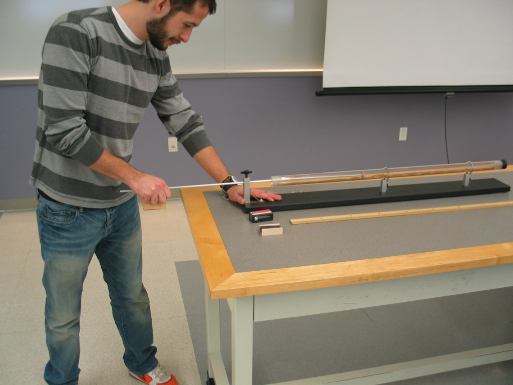 - This demo can be done as a prelude to, or instead of, the second part of the lab �Speed of Sound and Resonance�, which contains more detailed instructions. The metal rod should be clamped at its midpoint, and cork dust should be evenly distributed along the closed glass tube. Rotate the tube slightly so the cork dust is not on the bottom center to facilitate formation of node and anti-node patterns as the antinodes cause the dust to slide to the bottom of the tube. You should hear a screeching sound when firmly pulling the rosined leather clothe along the end of the rod (first photo). You may have to do this several times to create a good pattern in the cork dust. Measure the length of several nodes/antinodes (second photo). The average distance between two nodes equals one wavelength in air. Since we know the speed of sound in air we can then calculate the fundamental frequency. Furthermore, the fundamental wavelength in the rod is twice the length of the rod, so the speed of sound in the rod can also be calculated.