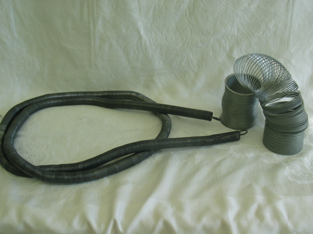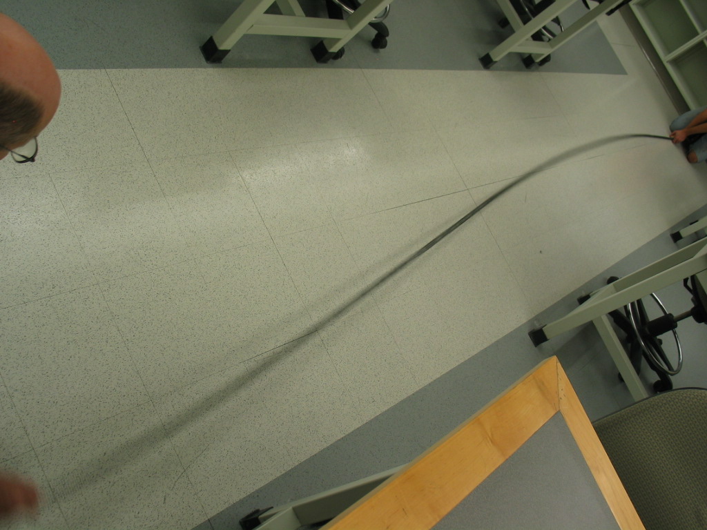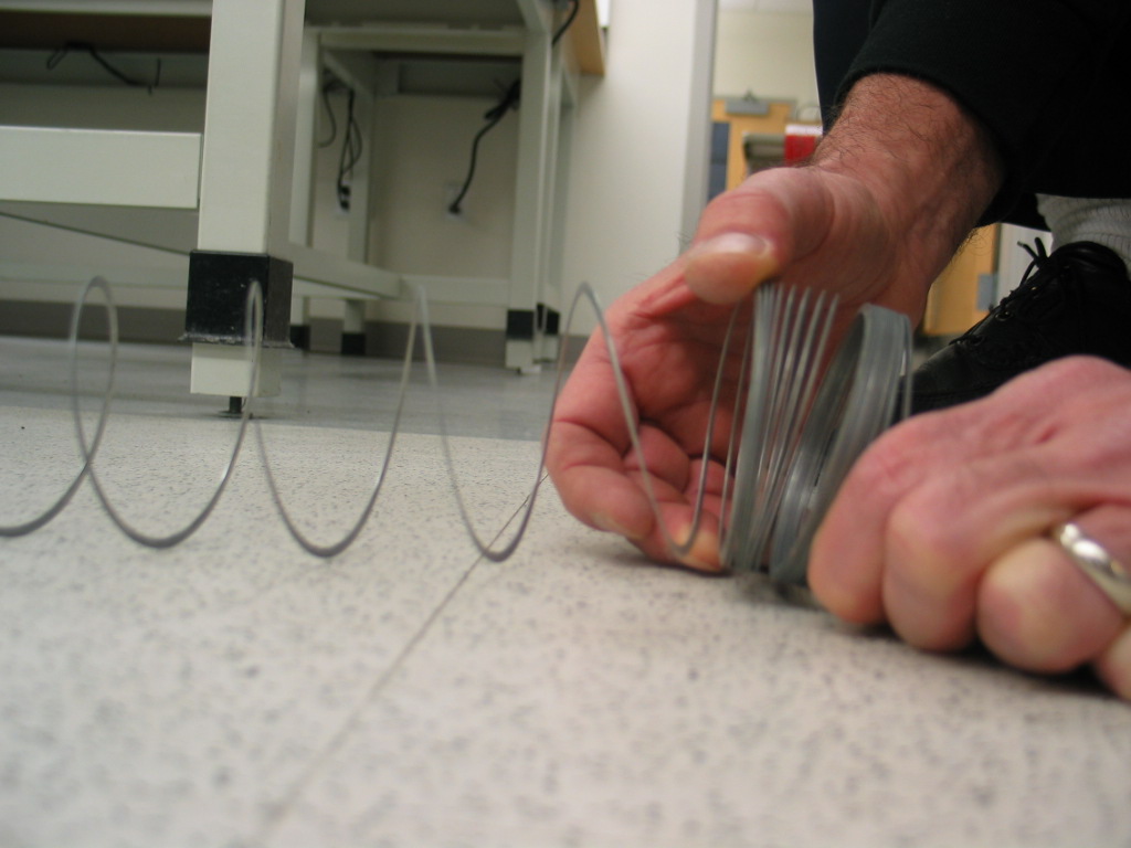 You will need two people to do this demo, one on each end of the spring. A sharp transverse snap of the long spring will launch a transverse pulse (top right photo). You can launch a longitudinal wave by compressing a section of the �slinky� spring with your hands (bottom left photo), then abruptly releasing it (bottom right photo). Although the photos show the demos being done on the floor, the transverse pulse demo can be done while standing as well.