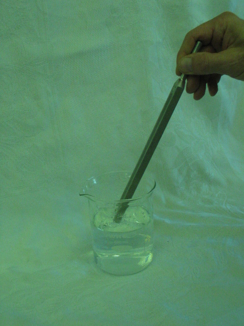 - Carefully fill the beaker about halfway, without splashing the sides. Take a long tuning fork, such as the 125 Hz fork shown, and sharply strike the desk top or the heel of your shoe hard, so as to make a loud tone (i.e. sound). Then, demonstrate that the origin of the sound is in fact a rapid oscillation of the tuning fork tines by striking the tuning fork again and sticking the tines into the water, creating a substantial splash due to their vigorous (unseen) motion.