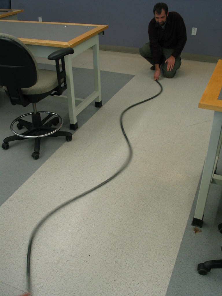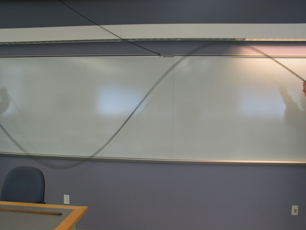 This demo may also be done standing up and shaking one end up and down in front of the white board to make it more visible to the whole class (left photo).