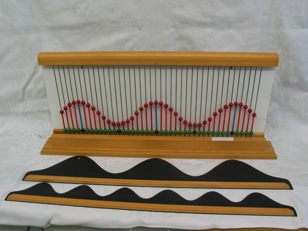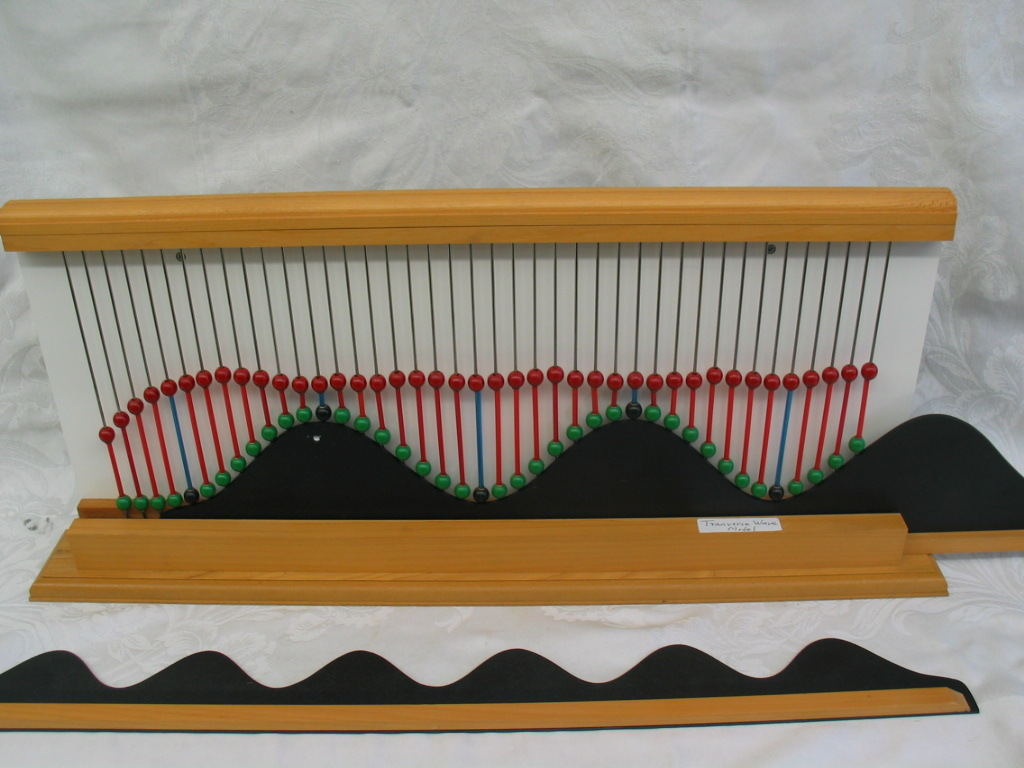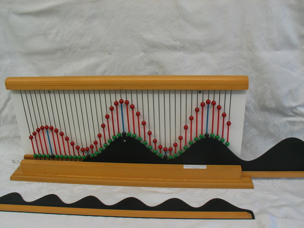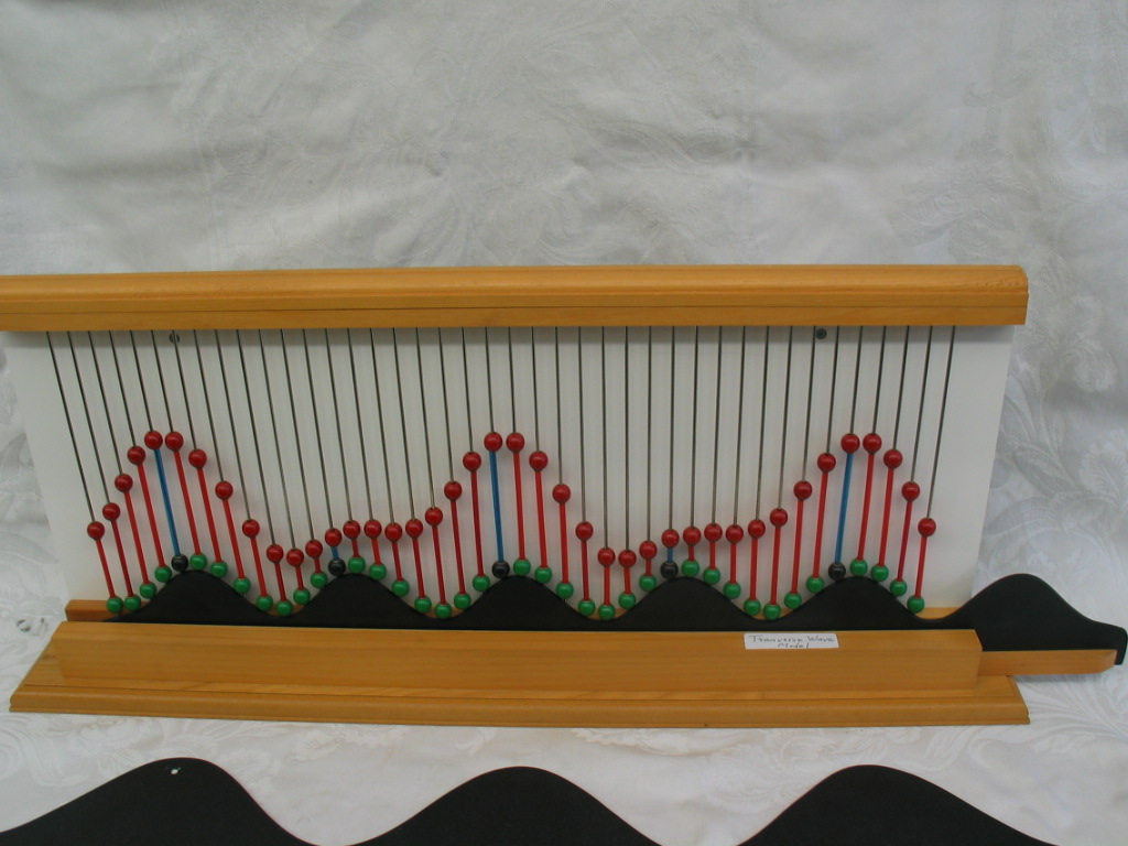Slowly insert the black waveform with the same amplitude and wavelength as the red beads. The inserted waveform, represented by the motion of the green beads, results in constructive interference (2nd top photo), followed by destructive interference (3rd photo). Superposition with a different wavelength and amplitude can be observed by inserting the other black waveform (last photo).