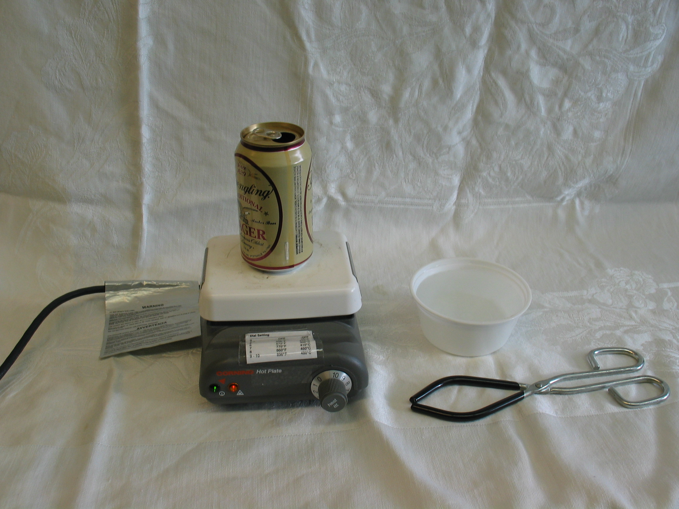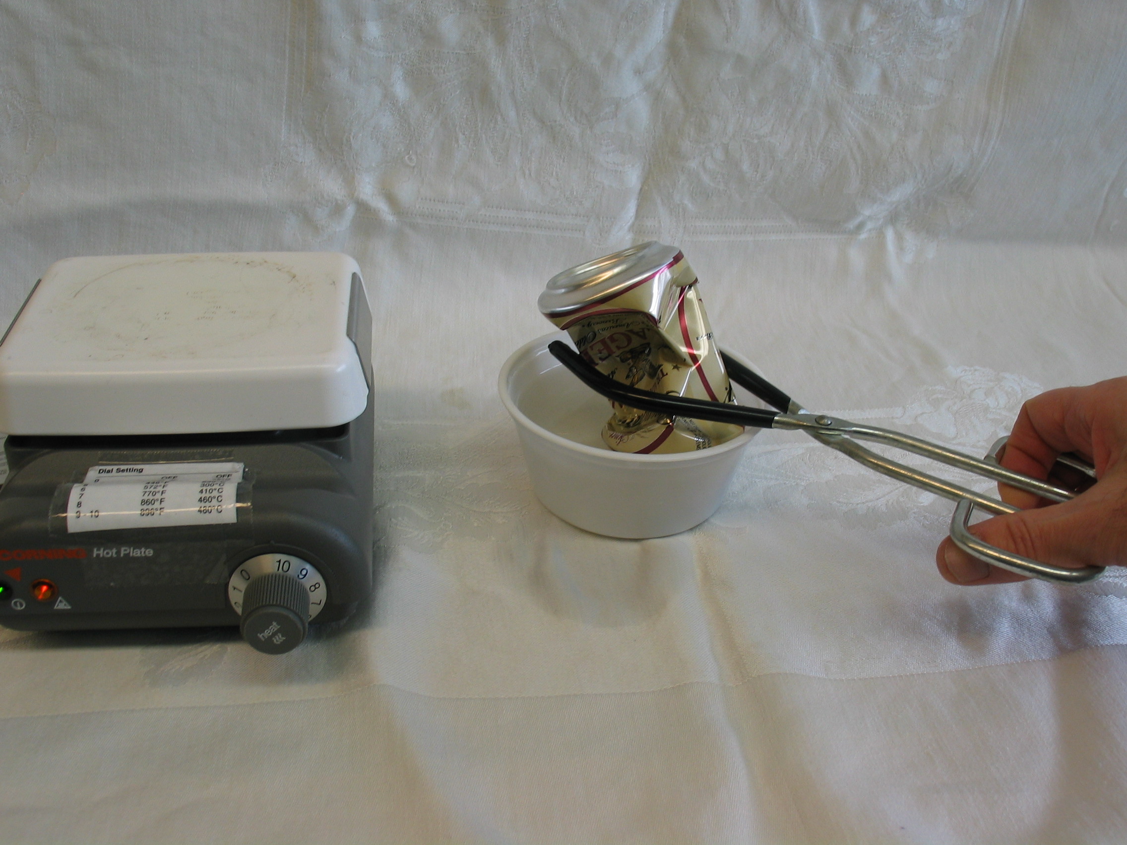 - Pour about 50 ml of water into an empty aluminum beverage can and bring it to a boil on a hot plate. If it�s not obvious from steam coming out the top, listen for the sound of boiling. (This may take many minutes.) When you are sure it has been boiling for a few minutes, quickly remove the can from the hot plate with beaker tongs, invert it and submerge the open end into cool water in the small bowl. Rapid cooling of the steam in the can causes it to condense, creating a partial vacuum, and the can will collapse.