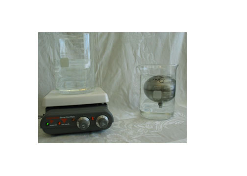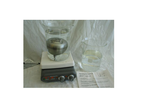 - Fill the 2000 ml beaker high enough with cold water (may need ice) for the ball to float without touching bottom. Set it on a large hot plate and turn the temperature up. As the water heats, it expands, causing its density to decrease. Within minutes the water density will be to low for the ball to float and it will sink to the bottom. (Second beaker shown is not needed.)