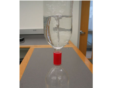 - Invert the bottle and swirl the water around several times to create a good vortex. Observe the formation of a funnel-shaped depression of the surface in the center, implying a region of low pressure there. It�s also interesting to observe how the water issuing into the lower bottle �sprays� outward, going along the wall of the bottle instead of straight down. Booklet describes many more possibilities.