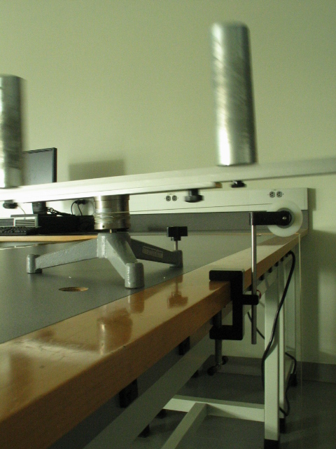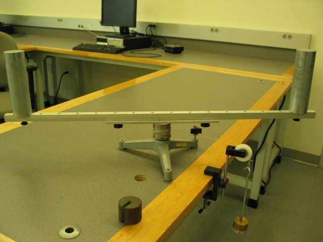 - The moment of inertia can be changed by changing the distance of the cylindrical masses from the axis of rotation, and the torque can be changed by changing the amount of mass on the end of the string hanging over the bench-edge pulley.
