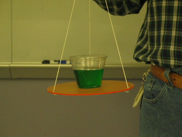 - Fill the cup half way with water and put a drop of food coloring in to make it more visible to students. Center it on the tray and begin swinging it in a large vertical circle.