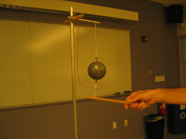 - Clamp the long rod vertically to a desk edge with a small horizontal rod clamped to the top. Suspend the heavy steel ball from the horizontal rod using white light string and a hook on the ball. Attach another short string to the bottom hook on the ball and to the wooden dowel, which serves as a handle for you to pull downward. Pull downward quickly and the bottom string breaks. Pull downward slowly and the top string breaks. The difference: Inertia of the ball!