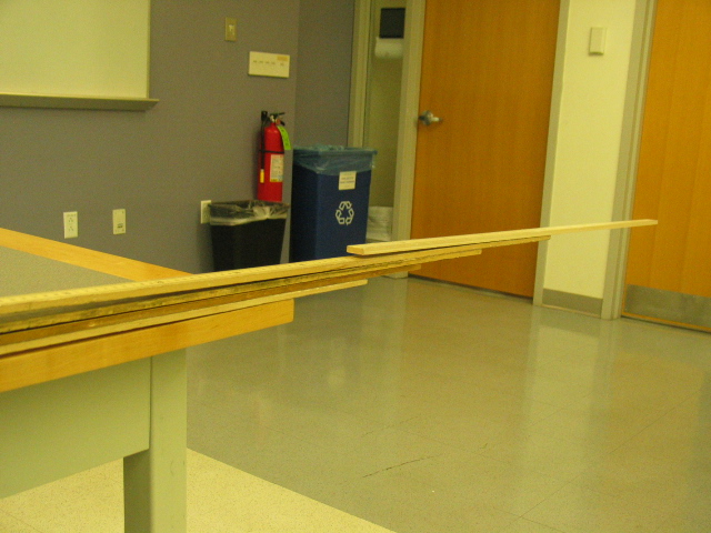 - Place one meter stick on the table with slightly less than half of it extending beyond the edge of the table. Now place a second meter stick beneath the first so it supports the same portion of the first meter stick as did the table. Move the two meter sticks together to extend as far as possible without them tipping off. Now place a third meter stick under the second so as to support the first two just as the table had, and move them together to extend as far as possible without them tipping off. Continue this procedure with the other meter sticks.