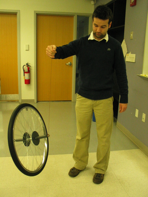 - Get the bicycle wheel rotating in a vertical plane as fast as possible, then, suspend it from the string attached to an end of the handle. The torque on the wheel from the pull of gravity results in precession. Show that rotation in the opposite direction results in precession in the opposite direction, in accordance with the right hand rule.