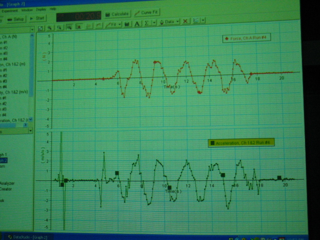 Use a force sensor on a dynamics cart and a motion sensor (top left) to plot force and acceleration vs. time on aligned DataStudio graphs. Use the eye bolt on the force sensor to accelerate the cart back and forth on the track several times. Then drag the acceleration data from the Summary panel on the left of the screen to the force vs. time graph. Right click and select Align. The correlation between these two plots should be apparent if data is good (top right).