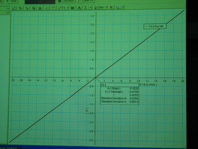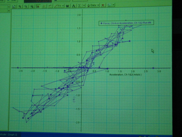 Next, make a force vs. acceleration graph by displaying a force vs. time graph and dragging acceleration data from the Summary panel to the time axis label. (bottom left). Fit a straight line to this graph to show that these quantities are well correlated (i.e. r close to 1). Note the slope of the line (bottom right). Add (or remove) a black, steel mass and repeat the above to show that the slope changes. Again note the slope of the line. Compare the total mass accelerated to the slope in each case.
