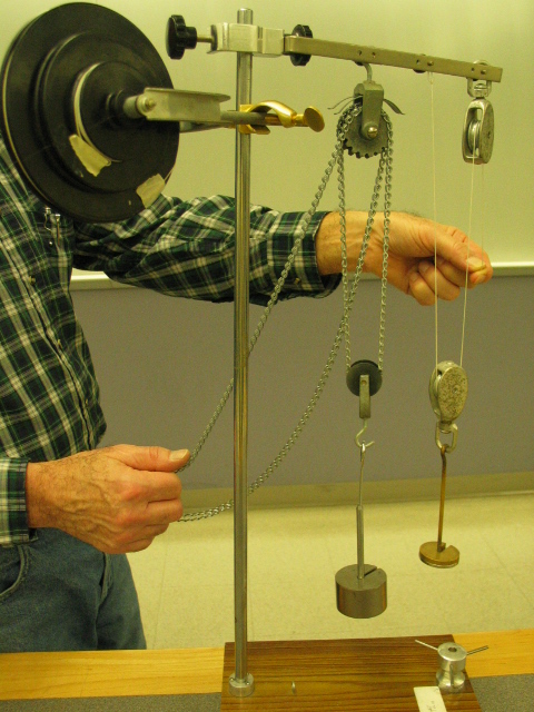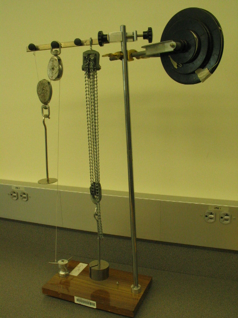 - This stand has a capstan, pulleys, a chain hoist, and a wheel and axle. Each of these may be used to show how a force applied thru a distance can be used to produce a greater force that acts thru a shorter distance. The chain hoist has two different diameter gear wheels on a common axle at the top which take in (or let down) different lengths of chain to the pulley, thereby raising or lowering it buy a much smaller amount than the length of chain pulled. Be careful to keep the chain aligned with the gears or it will slip.