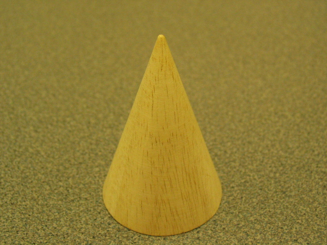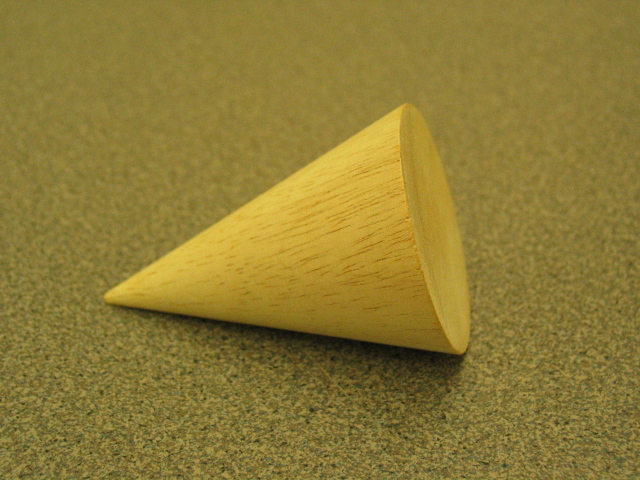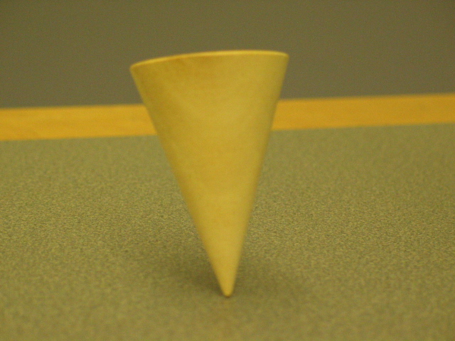 A cone can exhibit stable, unstable or neutral equilibrium on a flat, level surface as shown respectively in the above photos. The sphere (not shown here) can exhibit only neutral equilibrium on a level surface.