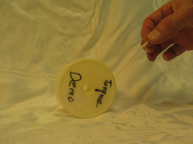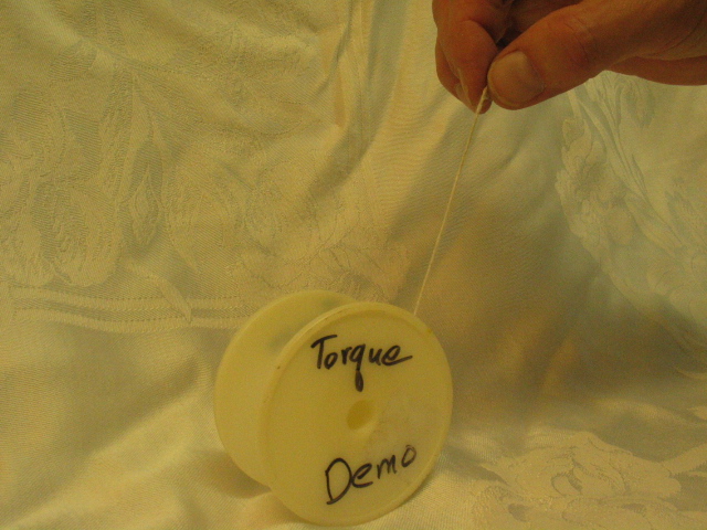 - When the string is pulled from a high angle (left photo) the line of force passes to the right of the point of rolling contact on the desk, and the spool begins to roll to the left, as expected. But if the string is pulled from a low angle (right photo), so that the line of force passes to the left of the point of rolling contact, the torque will be in the opposite direction and the spool will begin to roll to the right, to the surprise of most. (Practice first.)