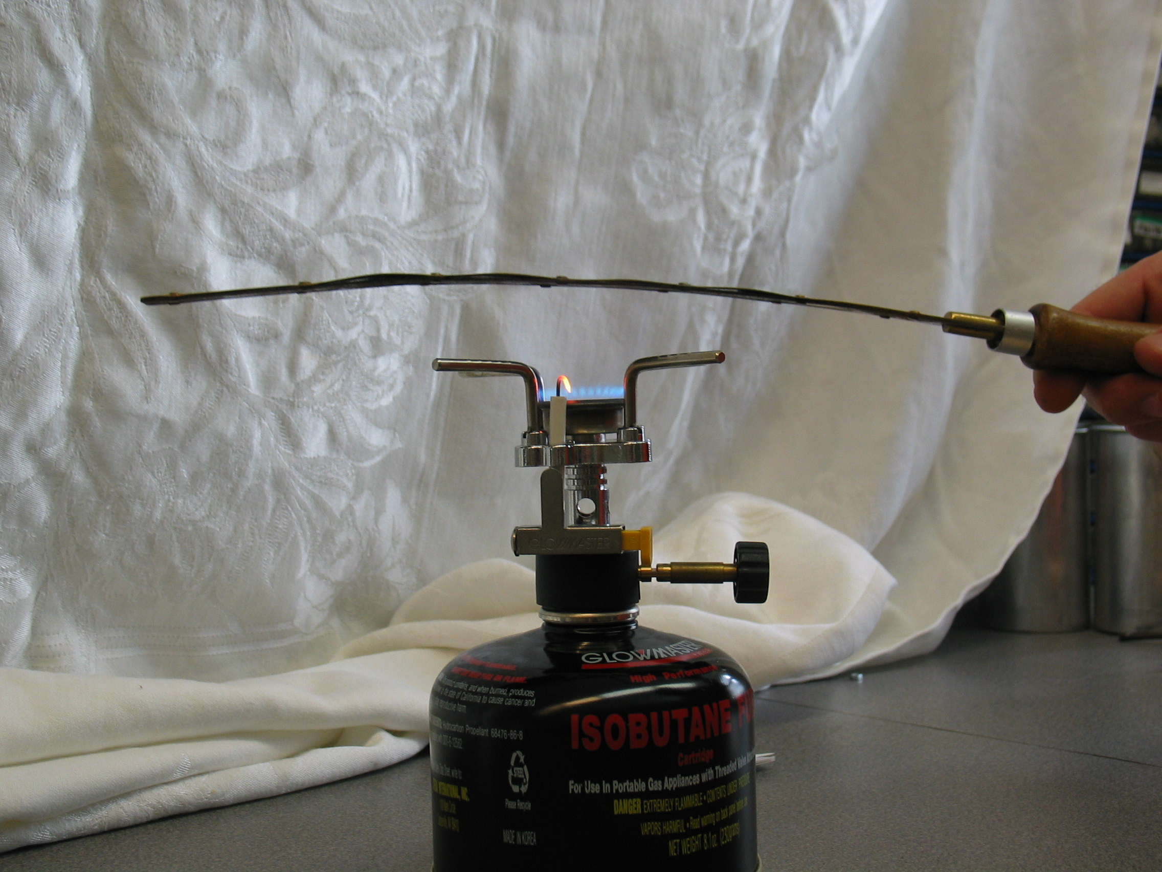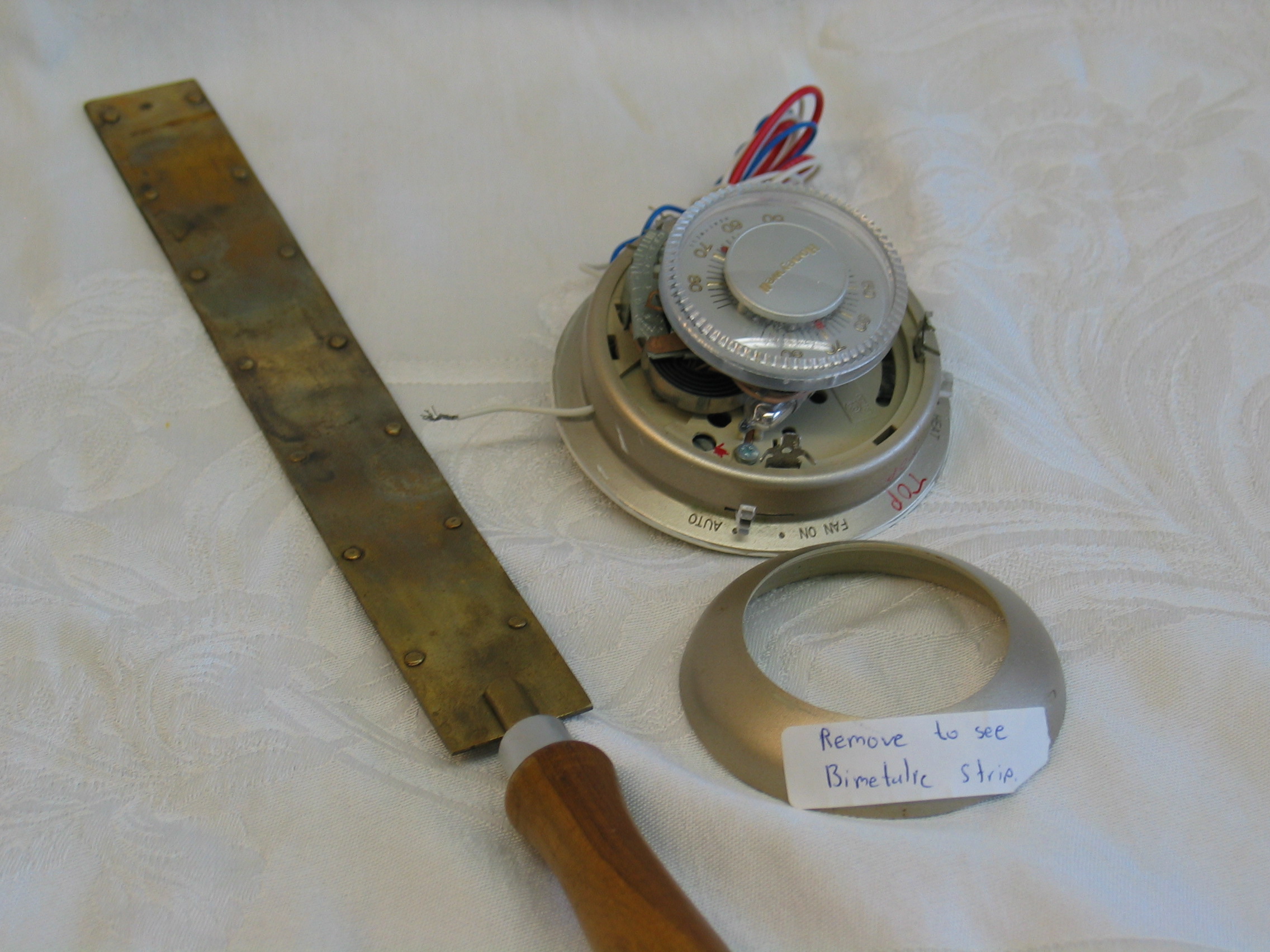 - The bimetal strip is brass on one side and steel on the other. When heated over a burner the brass expands more than the steel and the strip curves toward the steel side. (When cooled in liquid nitrogen, the strip curves toward the brass side.)