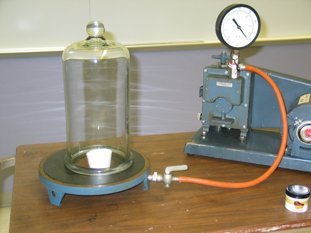 Room 136: bell jar & vacuum pump on wooden cart; Bottom of Styrofoam cup and eyedropper on shelf P3