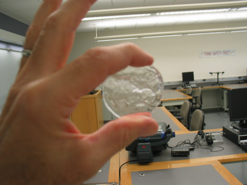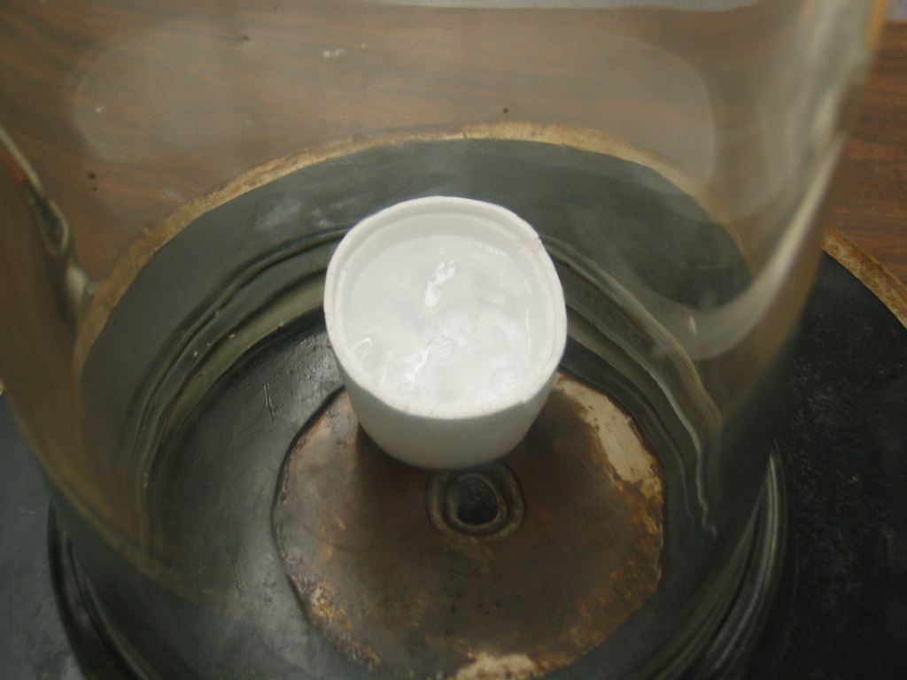 Use an eyedropper to cover the bottom of the bottom-part of a Styrofoam cup (about 2 droppers-full) and place it under the bell jar without covering the hole in the center of the base. Connect the bell jar to the vacuum pump with the valve at its base open (i.e. handle aligned with the tubing) and the thumbscrew valve on the top of the vacuum pump (just beneath the pressure gage) closed. (1st photo) Turn the vacuum pump on and observe the water boil, then start to freeze about 6 or 7 minutes after reaching �full� vacuum (2nd photo). The water should be frozen nearly solid in about 10 minutes. Shut the pump off and slowly open the release valve on the vacuum pump. You may remove the bell jar top only after the pressure inside it has reached atmospheric. (This may be difficult. Use both hands and be patient!) Dump the ice into your hand and hold it up to show the students (3rd photo).