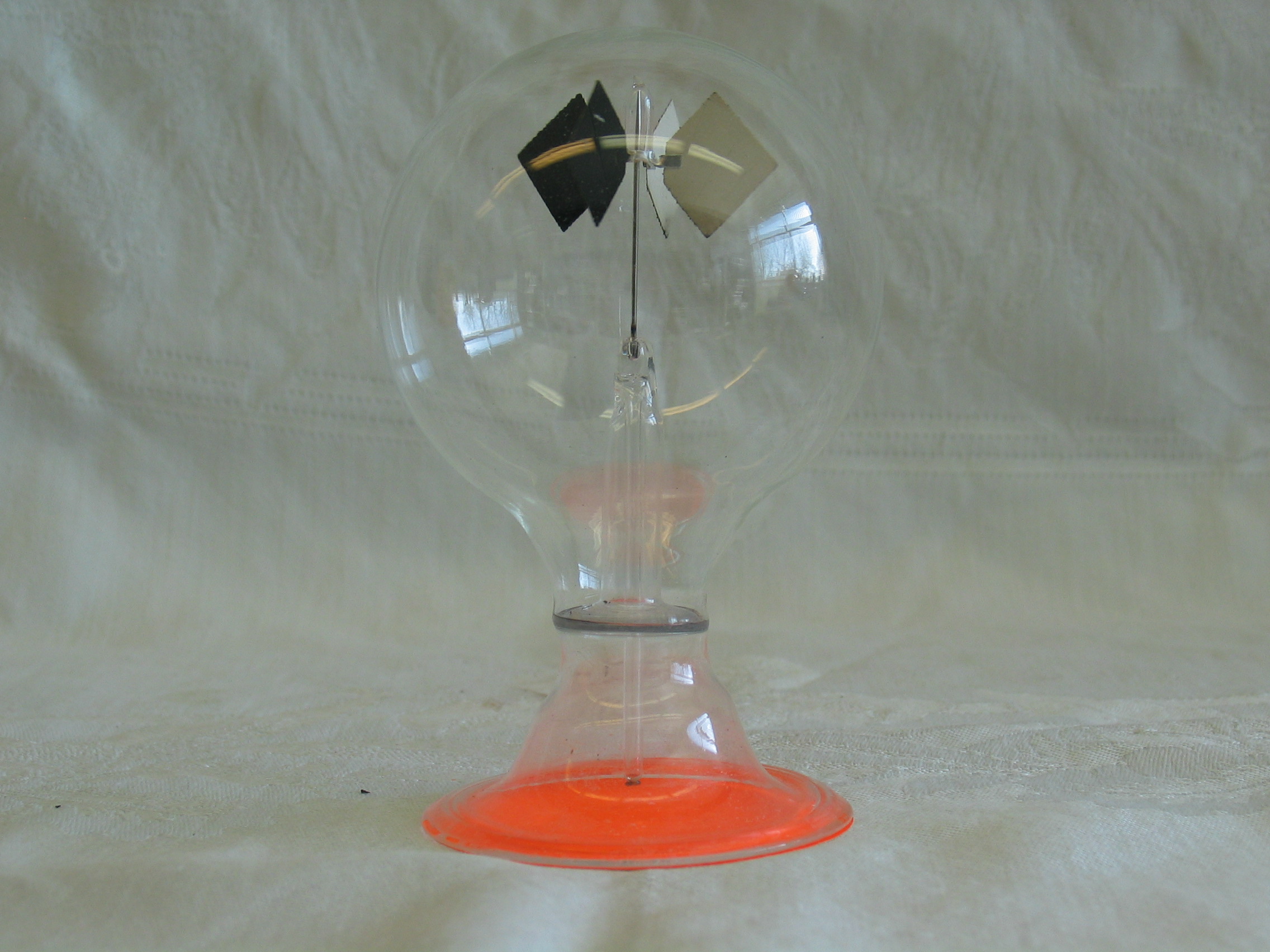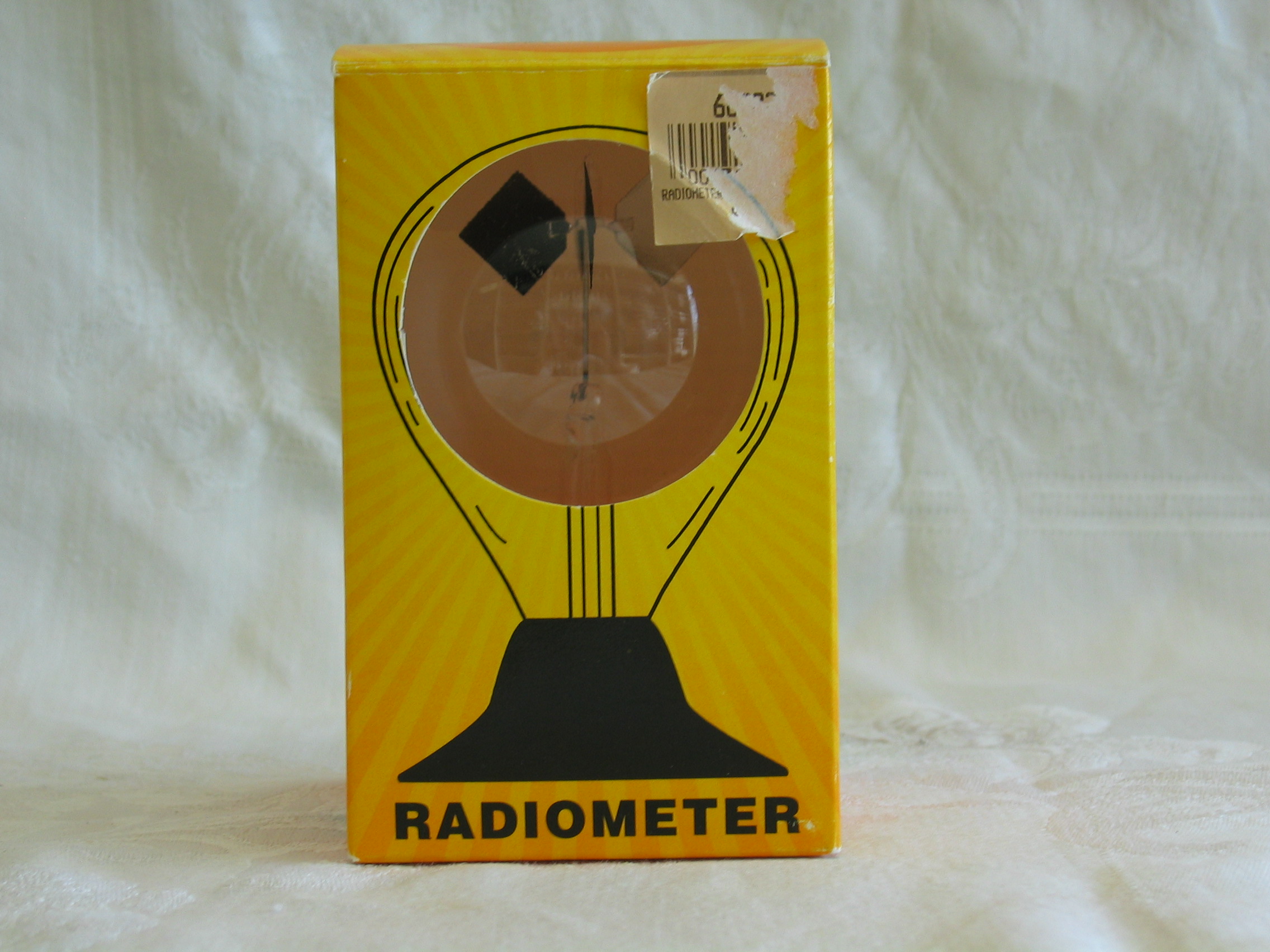 When illuminated with sunlight (or the yellow work light on P2) this timeless curiosity rotates exactly opposite to the direction which was predicted in the late nineteenth century by Crookes� when it was designed to detect the pressure of light predicted by Maxwell�s equations. This caused much consternation and debate until it was realized that the vessel had not been completely evacuated of air, and that the effect was due to the greater recoil of molecules incident on the hotter black sides than those incident on the cooler white sides of the vanes. It wasn�t until 1931 that a sufficient vacuum was obtained to demonstrate rotation in the opposite direction due to the greater recoil of light reflecting from the white sides.