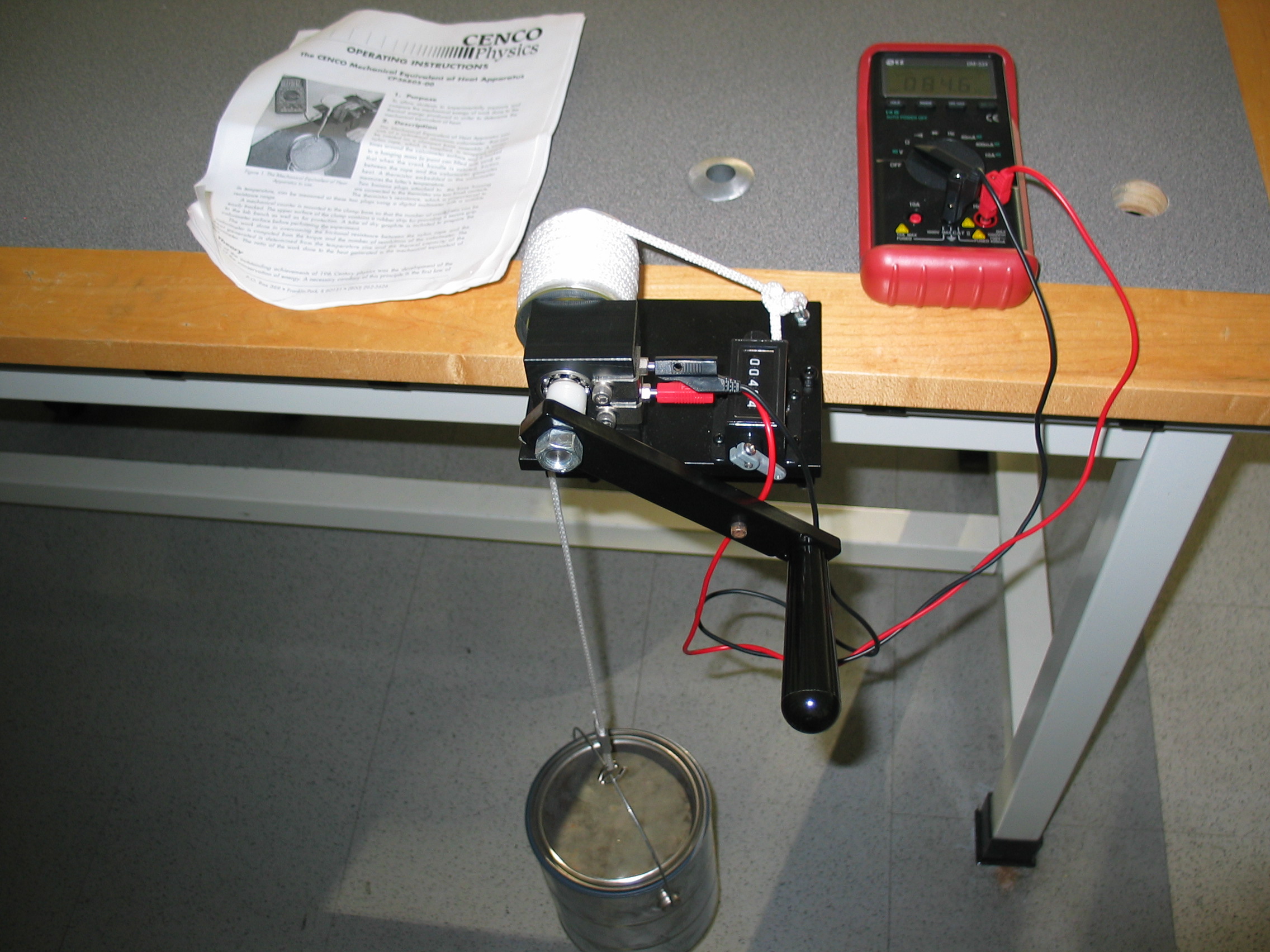 - This clever setup uses the fact that the friction of the rope wrapped around the cylinder several times provides enough force to hold essentially all the tension required to hold the bucket with a 2 kg mass in it. The torque is then equal to the radius of the cylinder times the weight of the hanging bucket and mass. When multiplied by 2pi radians per each revolution this gives the work done overcoming friction, which is converted to heat. Follow the Operating Instructions on the sheet and be prepared to do a lot of cranking!